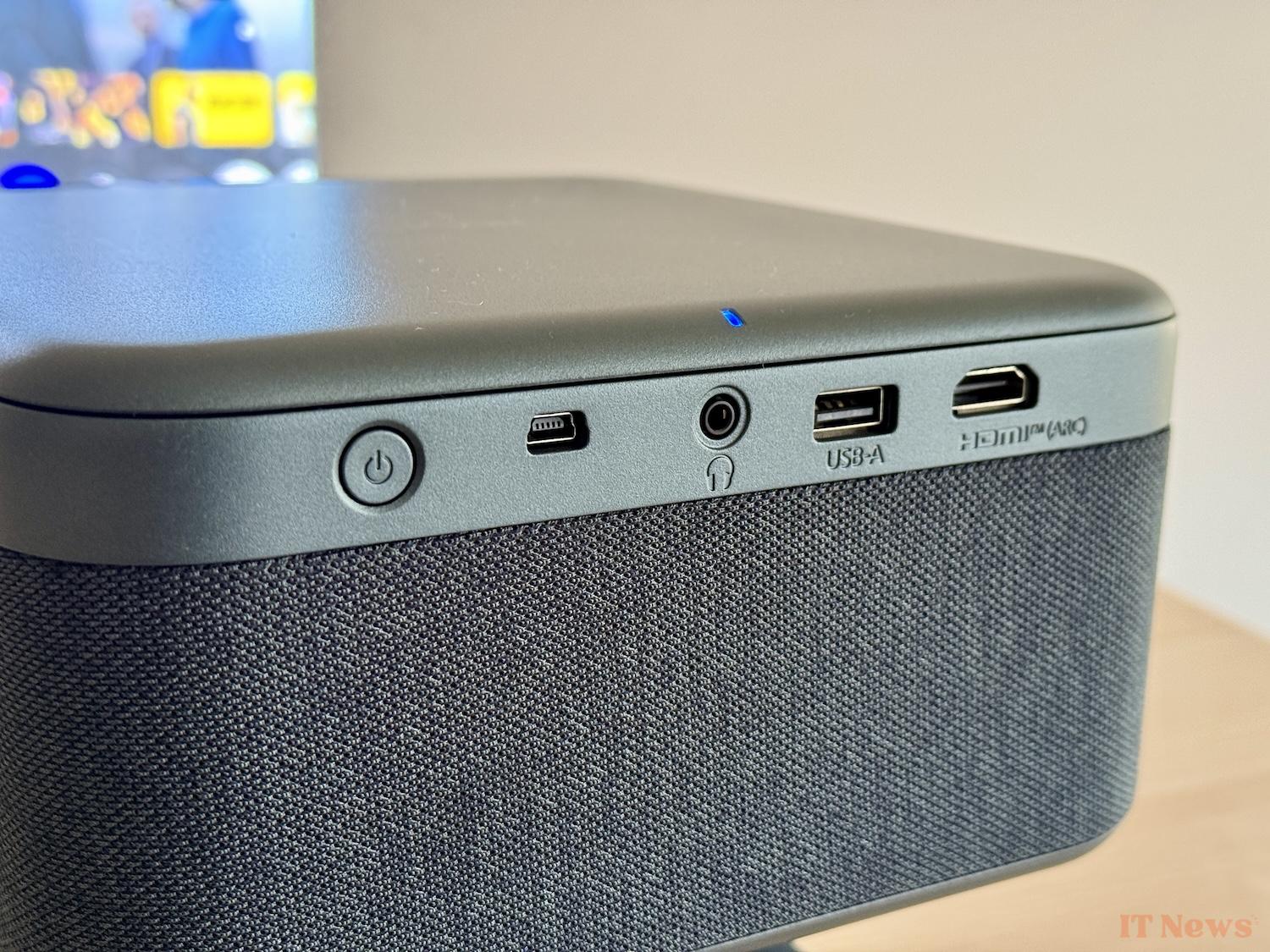 On one side of the stand, the power socket, on the other a Kensington slot to secure it if necessary. On the back of the device, you will find all the connections: HDMI 1.4 ARC, USB-A, 3.5 mm jack audio output and a mini-USB port exclusively reserved for the service. The power button is also located next to them. Some will find it limited, but it deserves to offer the essentials and above all to allow you to continue to easily handle the video projector rather than multiplying the cables that could hinder it.