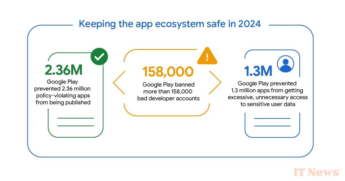 Thanks to the various systems set up upstream of the Play Store, 2.36 million non-compliant apps were blocked before they were put online in the store last year. 158,000 developer accounts were banned. And Google blocked 1.3 million apps from accessing sensitive data unnecessarily.