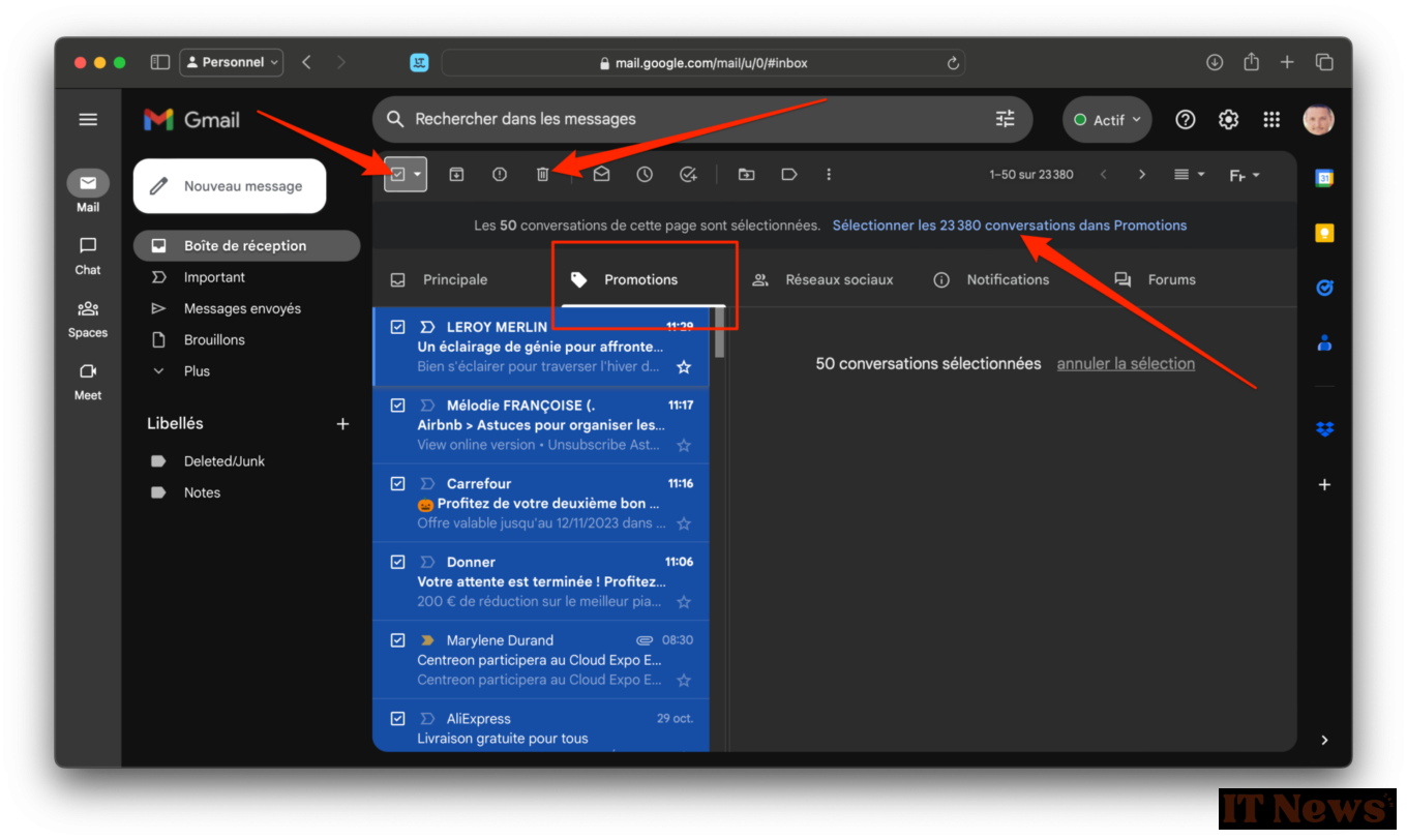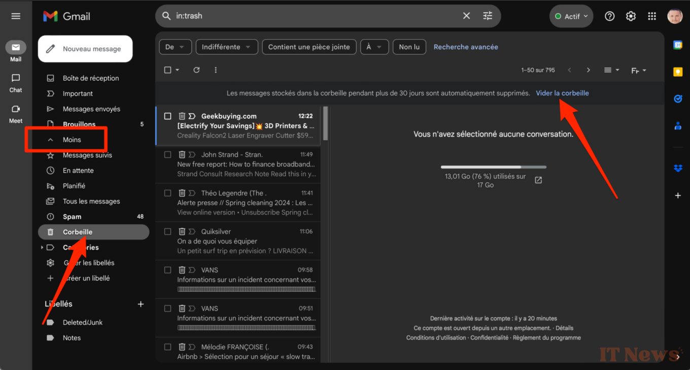 Don't forget to empty the trash once you have sent the messages to the trash. You will find it in the left column (sometimes hidden in the More drop-down menu). Finally, click on the Empty Trash menu to permanently delete the messages.