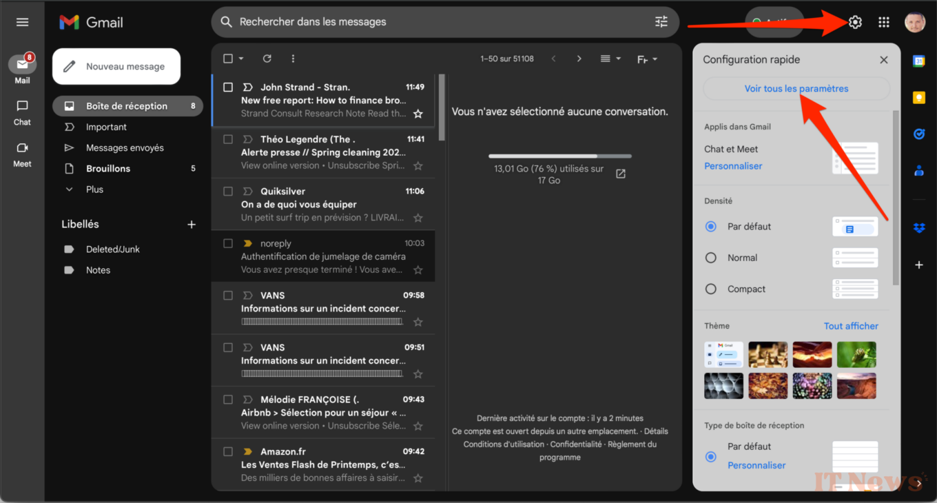 To reorganize the display of your emails, from the main window of your inbox, click on the icon representing a cogwheel, then on See all settings.