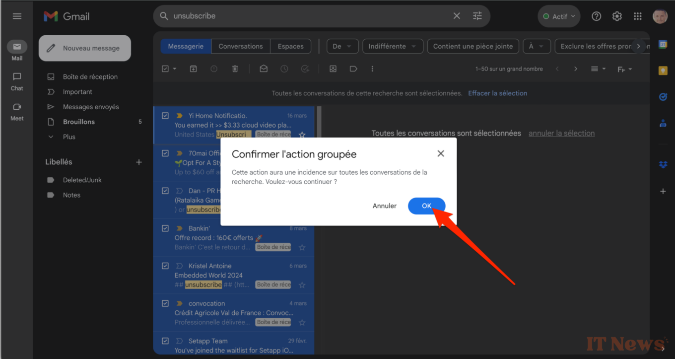 Then click on OK in the Confirm bulk action window that appears. Depending on the number of emails to delete, the operation may take more or less time.