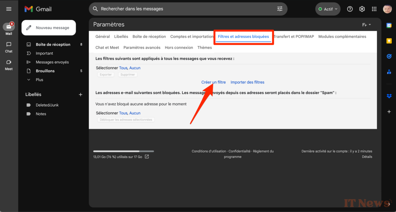 Then go to the Filters and blocked addresses tab and click on Create a filter.