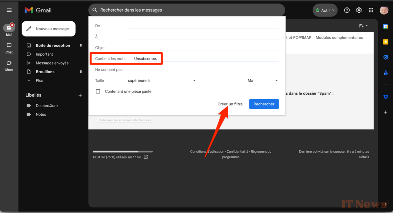 In the filter tool that appears, enter the term "unsubscribe" or "unsubscribe" in the line Contains the words then click on Search.