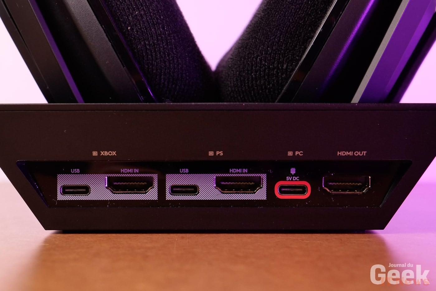 From this base, we already find an HDMI Pass-Through port that makes it possible to make the link between the three gaming systems and the famous TV or monitor that only has one HDMI port (let's say it dates from 2010). And for each of the gaming systems, there is a USB-C port for the audio part and an HDMI 2.1 port, except for the PC which only has the USB-C input because Logitech assumes that both consoles plug into a TV while the PC will necessarily be on a monitor, which is a bit stupid in itself because there are players like us, who play exclusively on monitors and this, even with consoles.