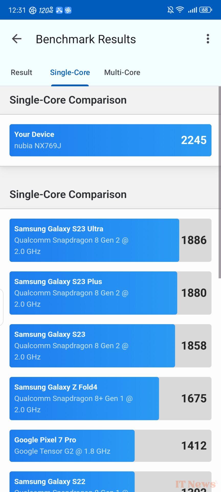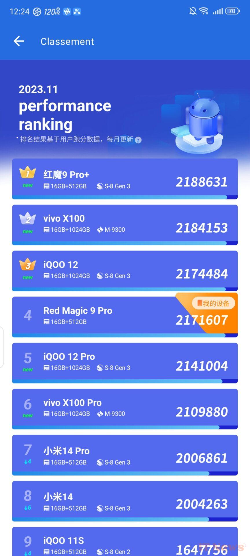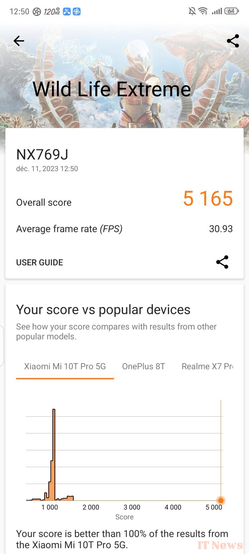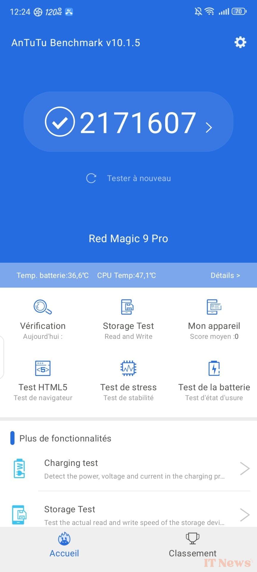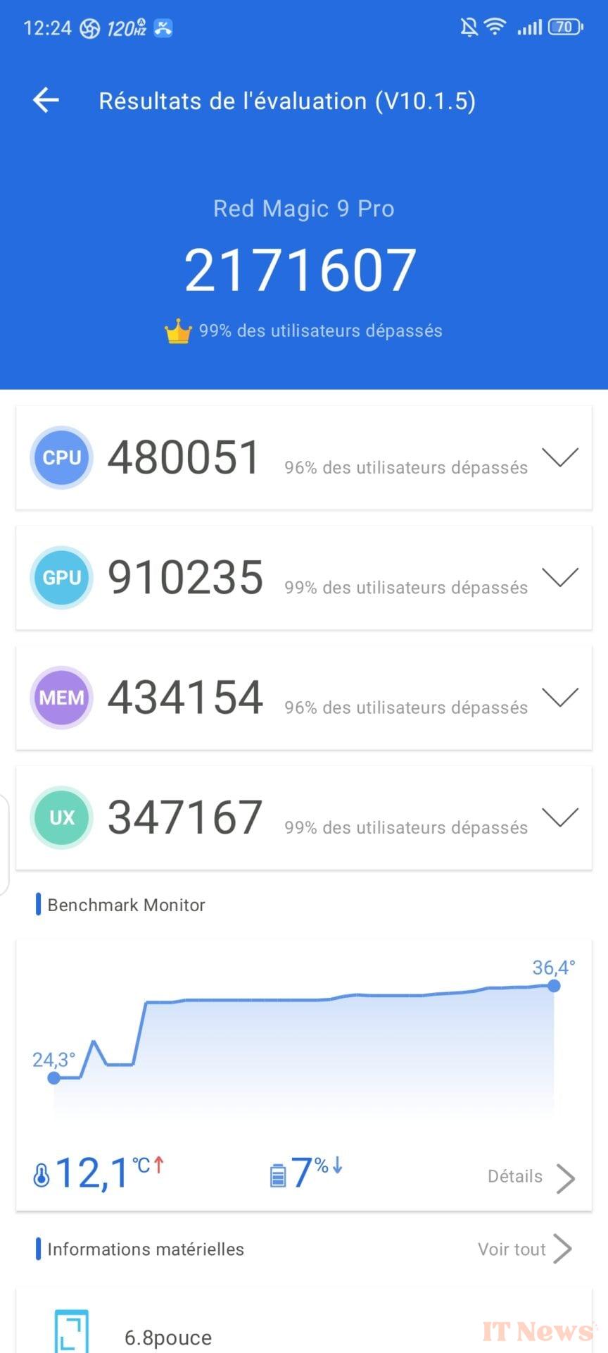 On the performance side, we won't surprise you too much since the RedMagic 9 Pro offers the new high-end Qualcomm SoC, the Snapdragon 8 Gen 3, LPDDR5x RAM and internal memory in UFS 4.0. We will also note the WiFi 7 to complete the whole thing. And unsurprisingly, the results of the various benchmarks offer very high-flying results! Overall, the benchmarks are obviously excellent. So, whatever your uses, the Snapdragon will come out without batting an eyelid. All the games run very well, regardless of the refresh rate. We will once again note a very appreciable resistance to throttling.