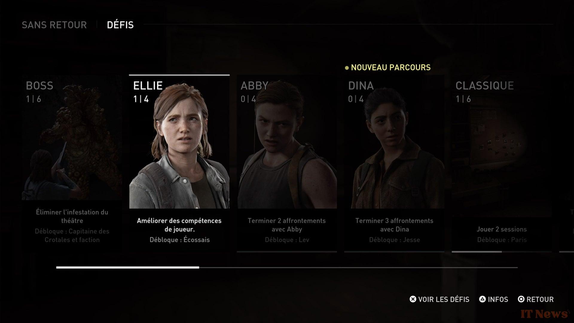 The main new feature of this version Remastered is the "No Return" mode or, in our good French "Sans Retour". This is a game mode inspired by the traditional "Rogue-Like". Playable solo only, it offers you to play one of the main characters of The Last Of Us Part II with team Ellie (Dina, Jessee, Tommy and Joël) as well as team Abby (Lev, Yara, Manny and Mel). In total, 10 playable characters with a series of challenges to complete.