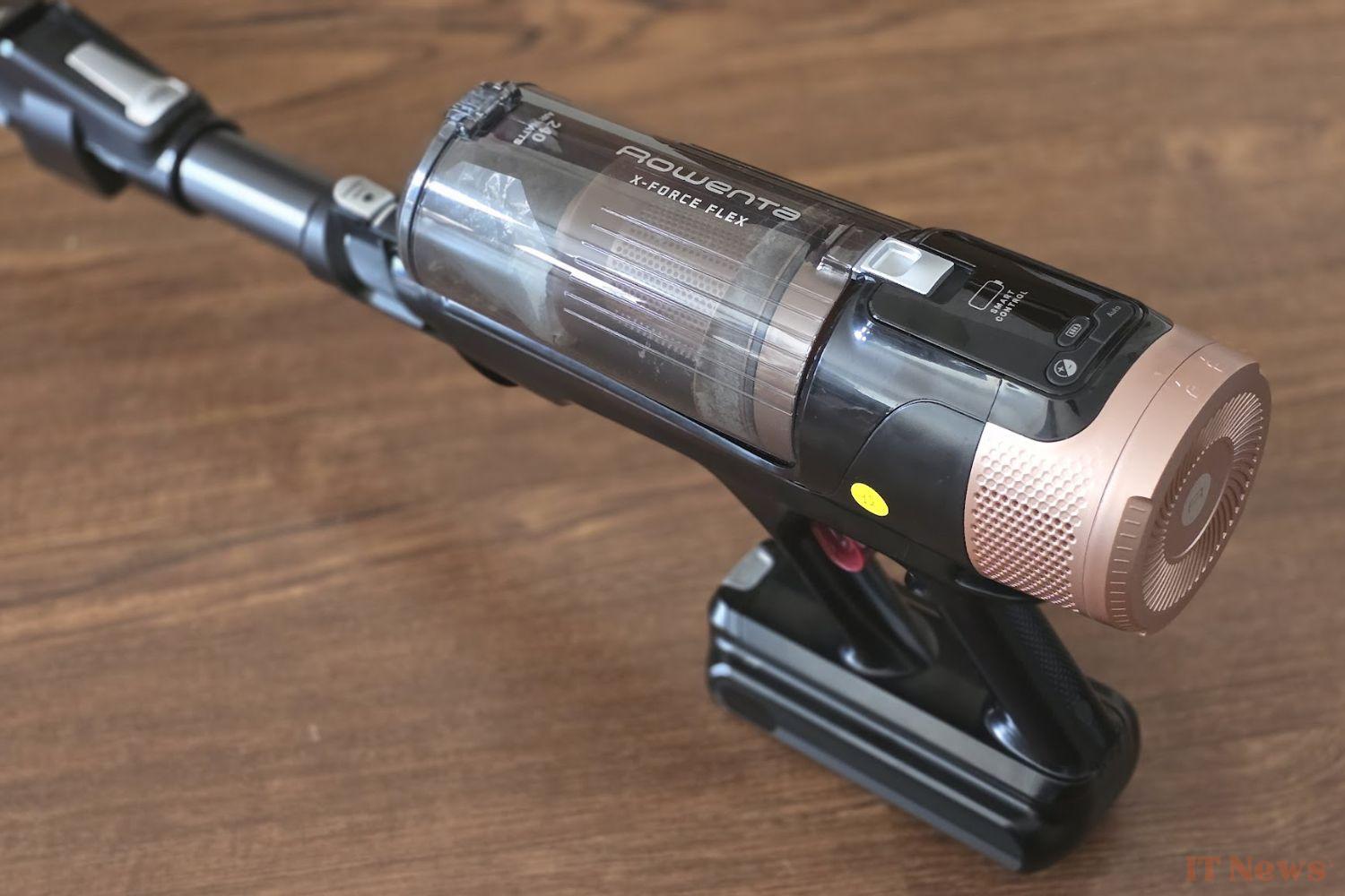 On a daily basis, the Rowenta 14.80 is simple and efficient. We appreciate its ease of use, as well as its ability to adapt to different situations. In Auto mode, the vacuum cleaner automatically changes its suction mode depending on the floors detected. If you prefer manual power management, simply select one of the three available power settings (Eco, Normal, Boost), or use the trigger to make the motor roar to its maximum in more congested areas. Without being particularly quiet, the Rowenta X-Force Flex 14.80 ensures very bearable noise pollution. Its double-walled soundproofing chamber filled with recycled sound-absorbing foam, already at work on the 13.60 model, ensures peaks of only 68 dB in Eco mode.