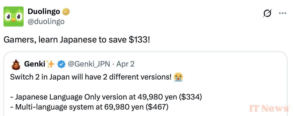 It's Nintendo's way of responding to the weak yen, but it's infuriating for gamers in the rest of the world. Duolingo has also not failed to capitalize on the issue by reminding us that you can save money by learning Japanese...