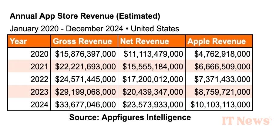 To find out how much the App Store makes, you have to turn to Appfigures. Last year, the store generated $33.6 billion in revenue in the United States: thanks to its commission (from 15 to 30%) on in-app purchases, Apple recovered nearly a third of that, or $10 billion. The amount pocketed by the manufacturer has more than doubled in four years: in 2020, the sum amounted to 4.7 billion for 15.8 billion in gross revenue.