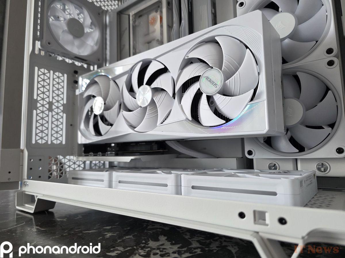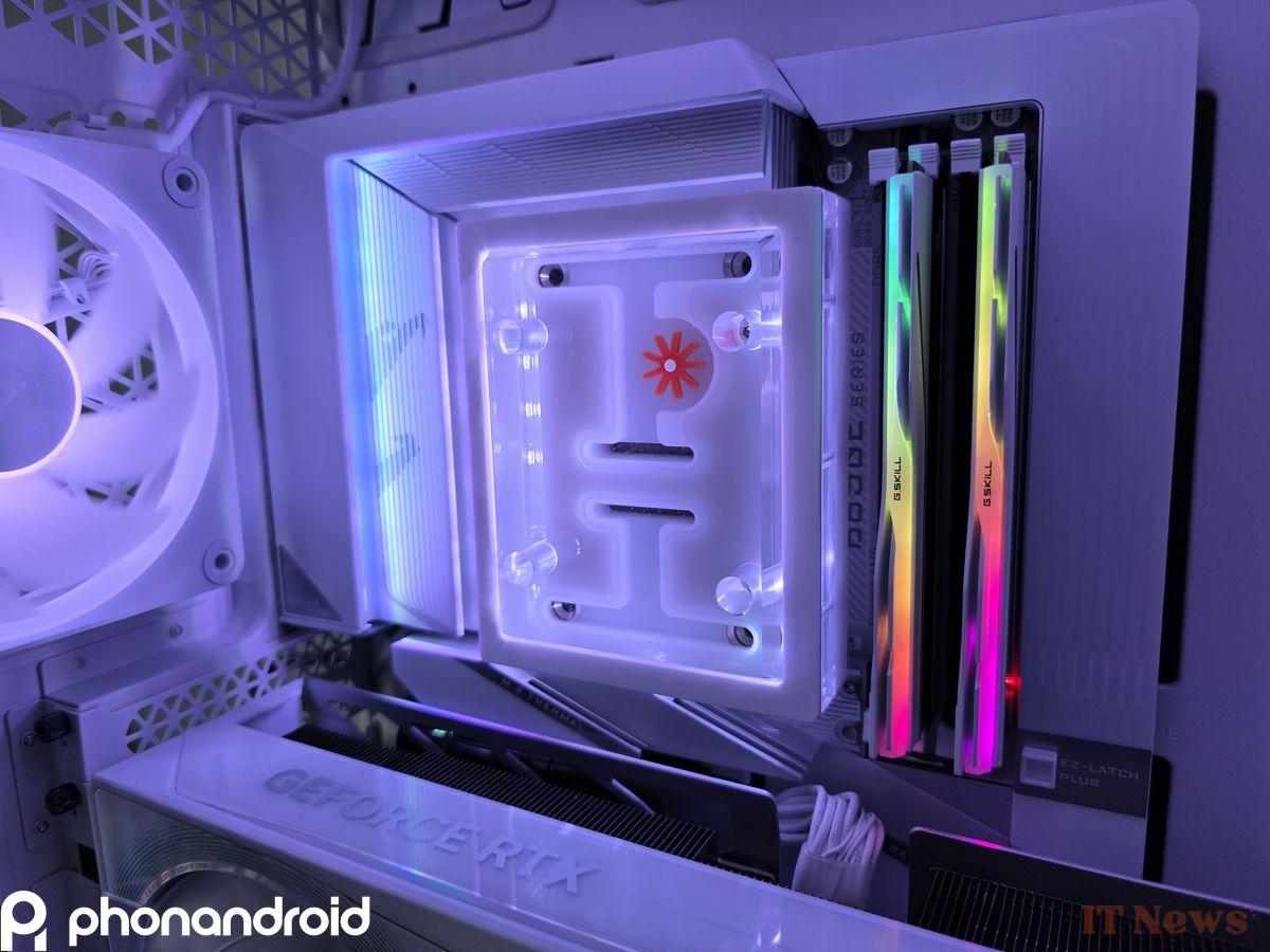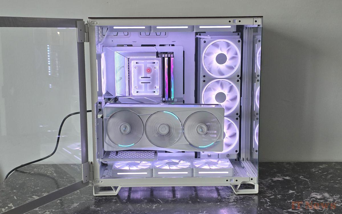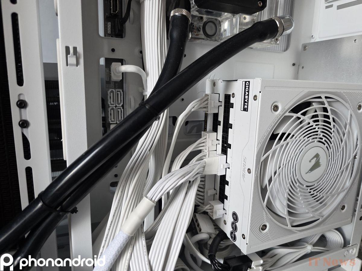 But let's focus instead on what Cybertek wants to highlight: the quality of the assembly. On this point, nothing to complain about, the product presented is of quality. What we particularly like is the care taken with the visual consistency of the whole, whether in terms of the colors (white and wood), the choice of the dual-chamber aquarium case, the LEDs (also white) as well as the arrangement and fixing of the components. We note the choice of the RTX 5080 Master Ice from Aorus, with its integrated screen that makes its little effect. It doesn't serve any purpose, but it adds an additional premium touch.