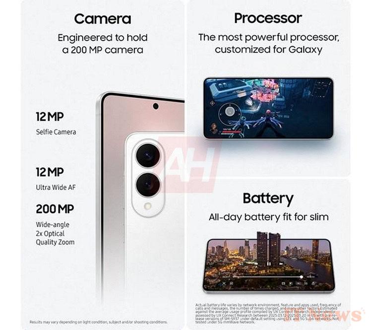 According to the images, the brand's ultra-thin and lightweight smartphone will be available in three colors: black, sky blue, and white. Samsung insists that despite its thinness, the phone remains durable, highlighting a titanium design, Gorilla Glass Victus 2 screen protection, and IP68 waterproof certification.