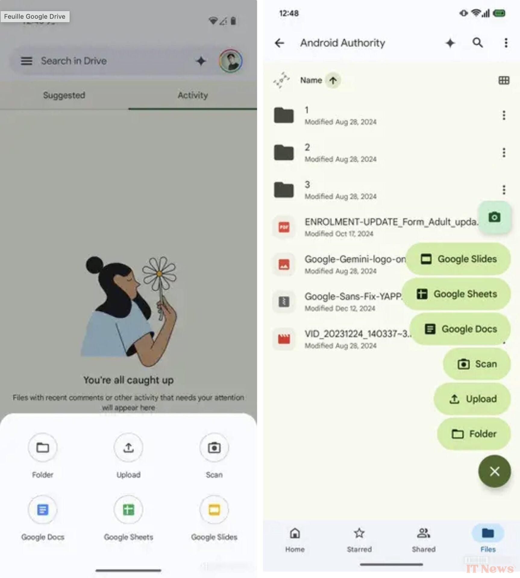 Until now, pressing the famous "+" button at the bottom right of Google Drive triggered the opening of a panel at the bottom of the screen, listing six possible actions: create a folder, upload a file, scan a document, or launch a Docs, Sheets, or Slides file. This system, while functional, wasn't the most ergonomic, especially if you use your smartphone with one hand.