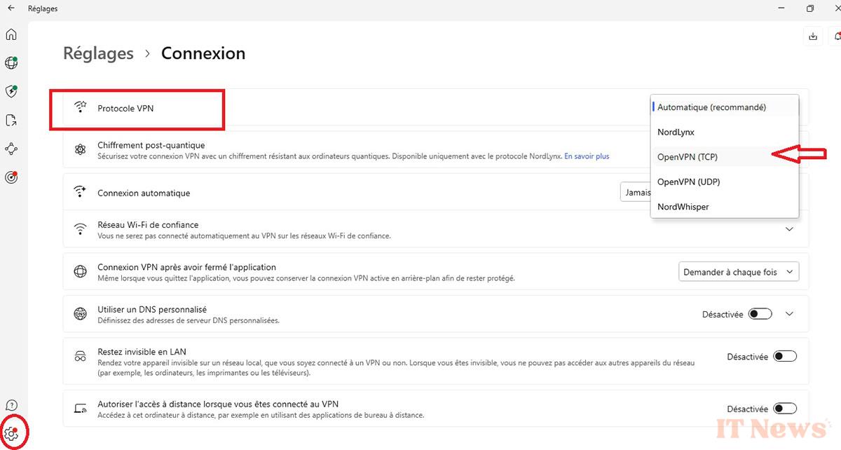 You are now ready to enjoy your VPN connection on any other device via the WiFi access point you just created. There is now one last step. This consists of configuring the OpenVPN protocol (TCP) in the NordVPN settings. Indeed, VPN connection sharing does not work with Nordlyx and other protocols. It is therefore very important to validate this step.