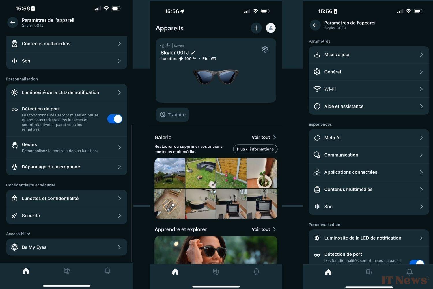 The glasses come with a dedicated app, Meta AI (formerly called Meta View). This app allows you to configure the accessory, adjust the artificial intelligence, or manage real-time translation (more on this later). It's also within this app that you'll find all the content recorded with the camera, such as photos and videos. The app lets you download the content of your choice and drag it into your smartphone gallery. The glasses have 32 GB of storage, which is more than enough since we regularly transfer the content saved on our phone.