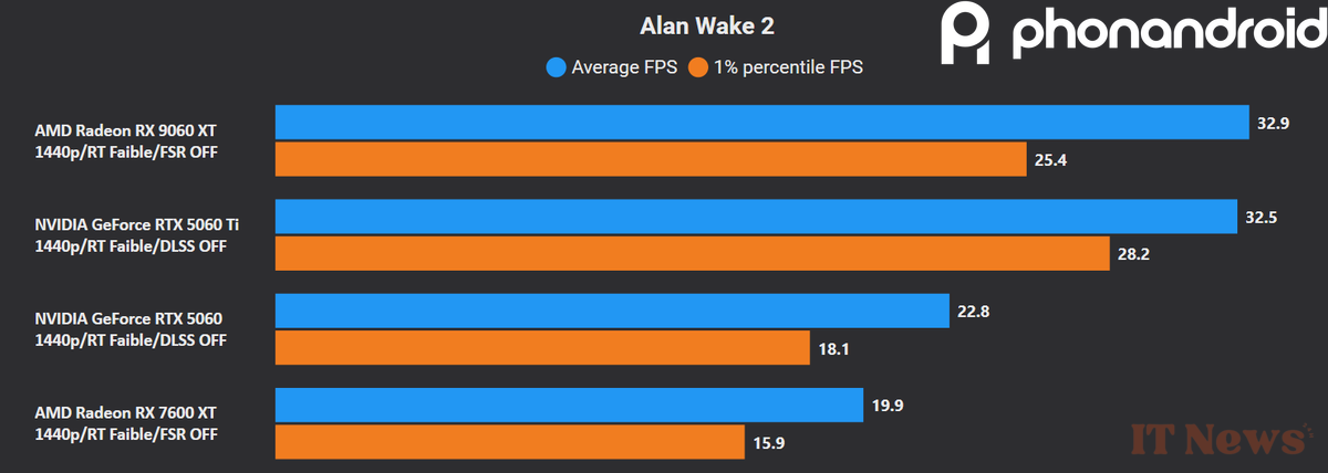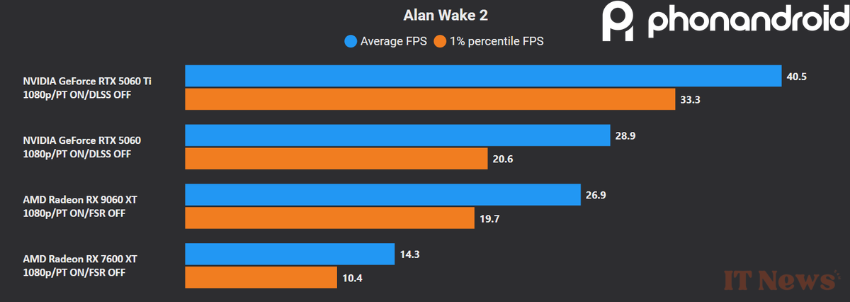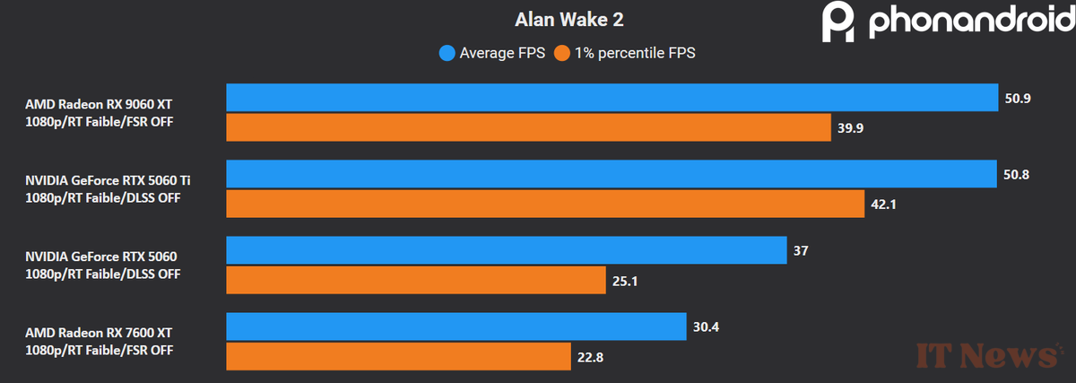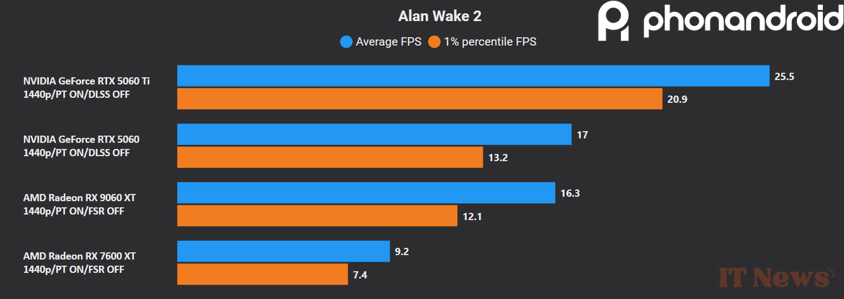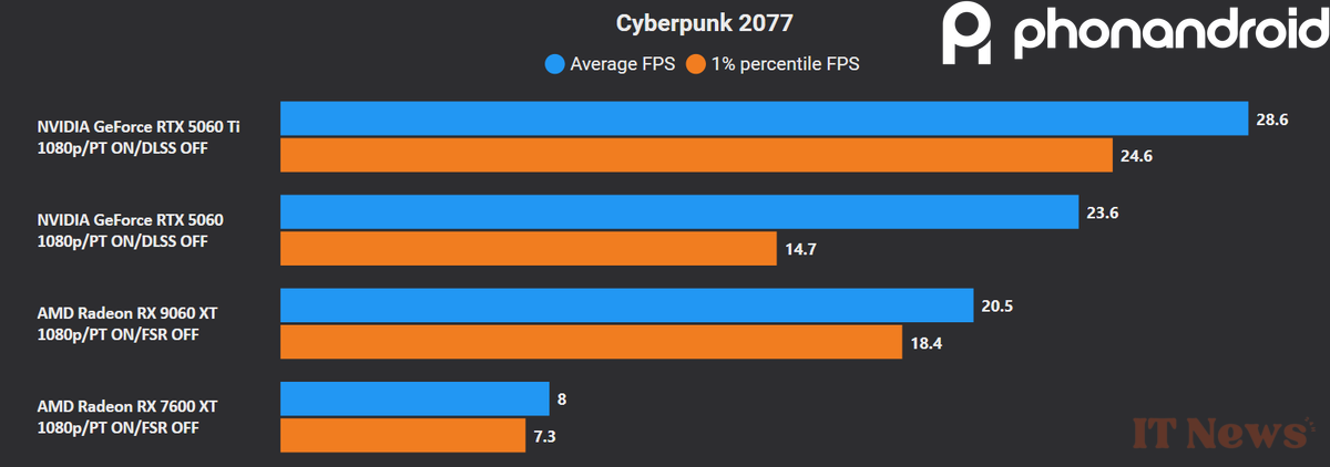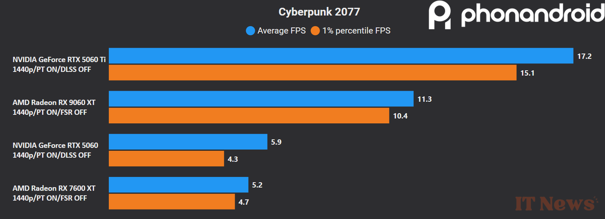In 1080p, with path tracing enabled, the RTX 5060 Ti remains ahead, offering double the performance of the RX 9060 XT. The classic 5060 is also superior. It should be noted, however, that all these cards display sufficient performance for the game to be usable with DLSS and FSR, even natively in the case of the 5060 Ti.