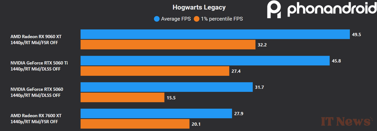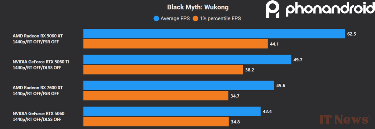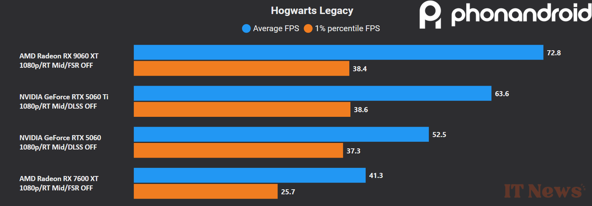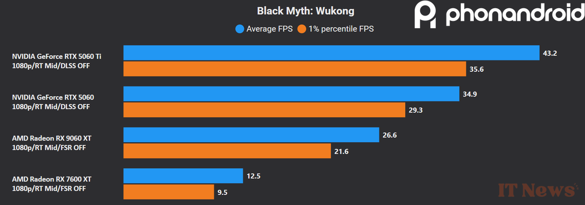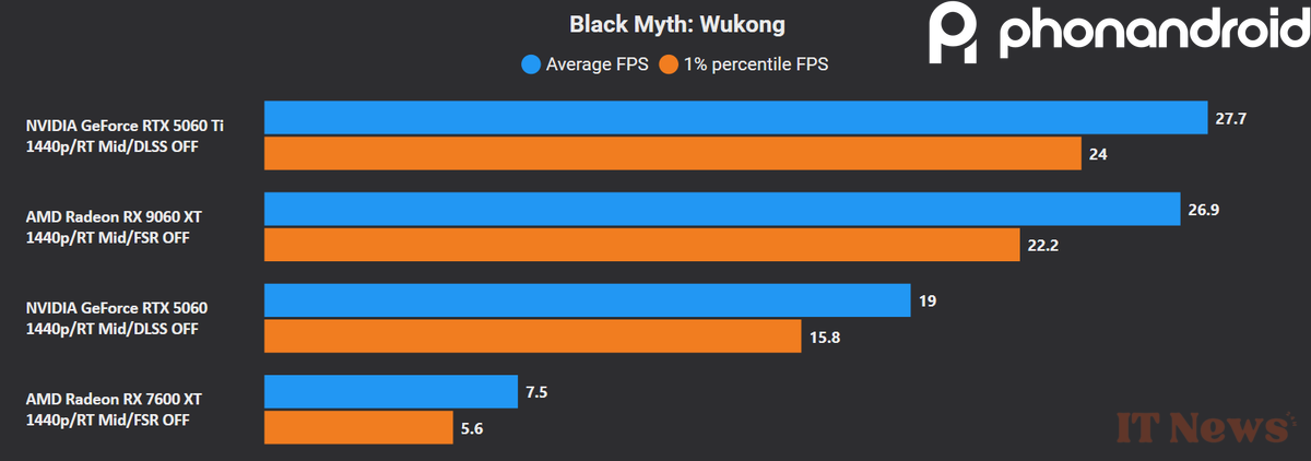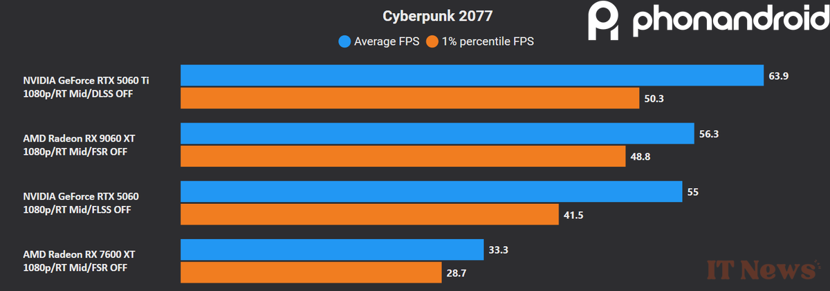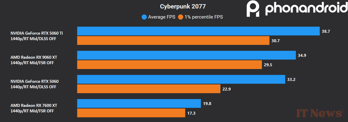 In RT Mid, the RTX 5060 Ti remains once again 11% higher, while the RX 9060 XT is on par with the RTX 5060, while offering greater stability.