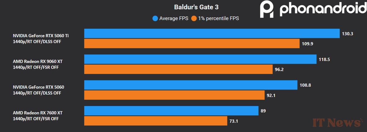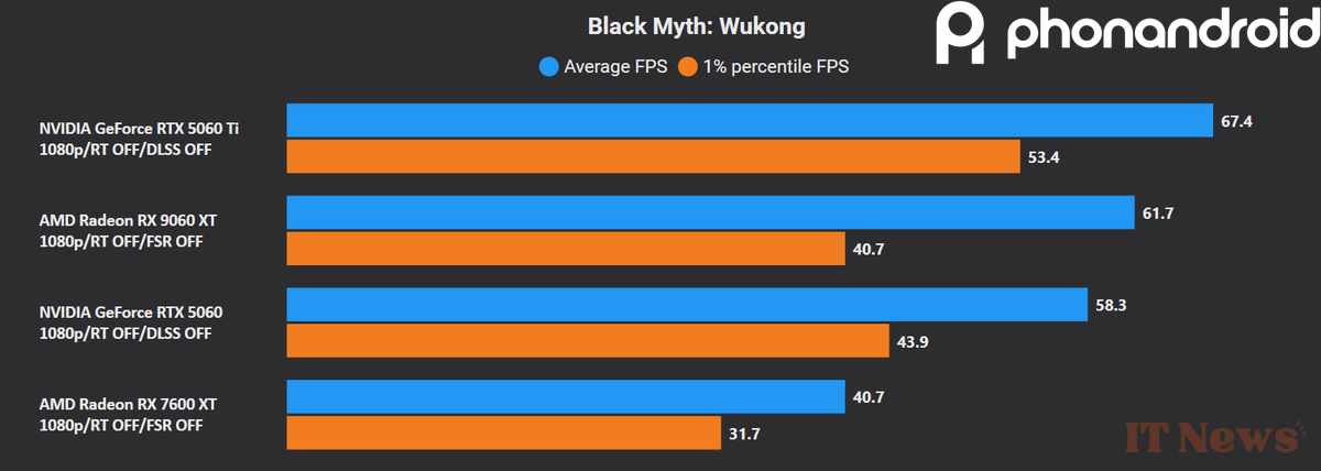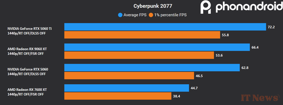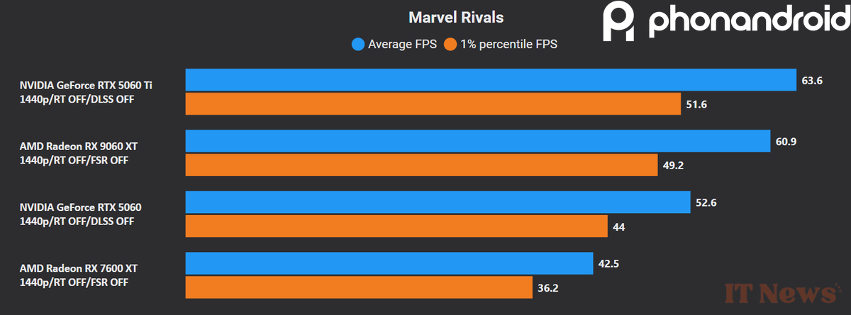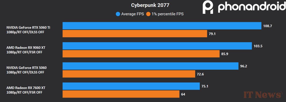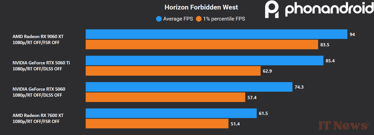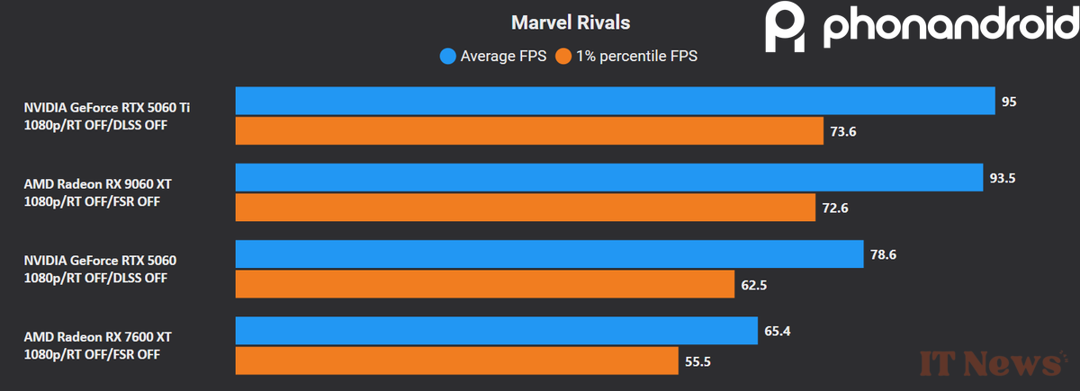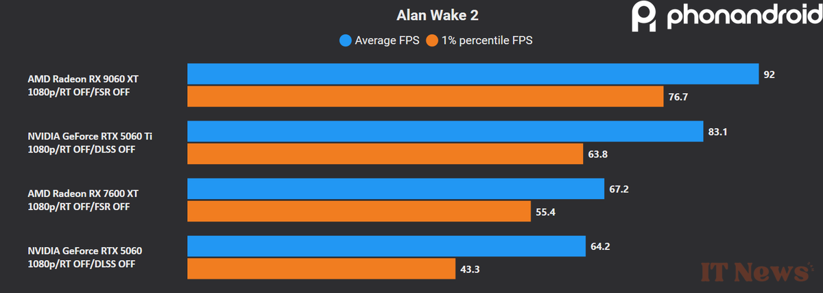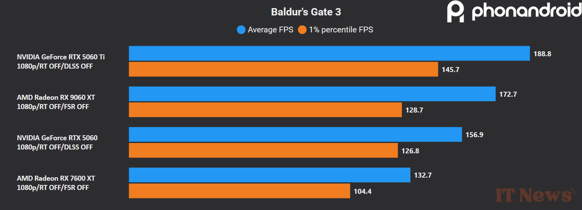 Without ray-tracing, the RX 9060 XT is theoretically in the lead again, but the RTX 5060 Ti sends essentially the same average FPS while keeping the experience more stable. The 5060 does much better, but remains behind by 21%.