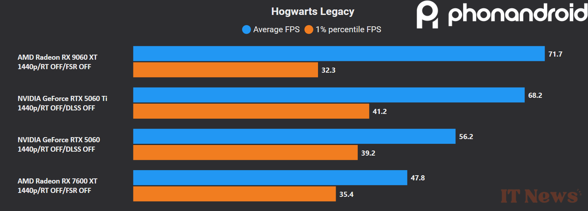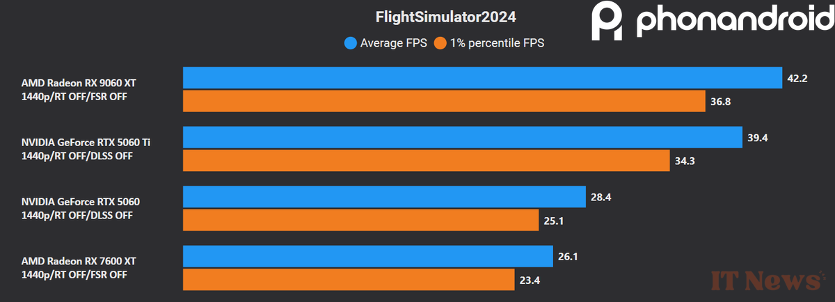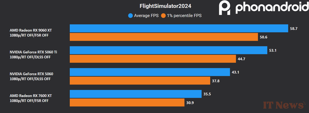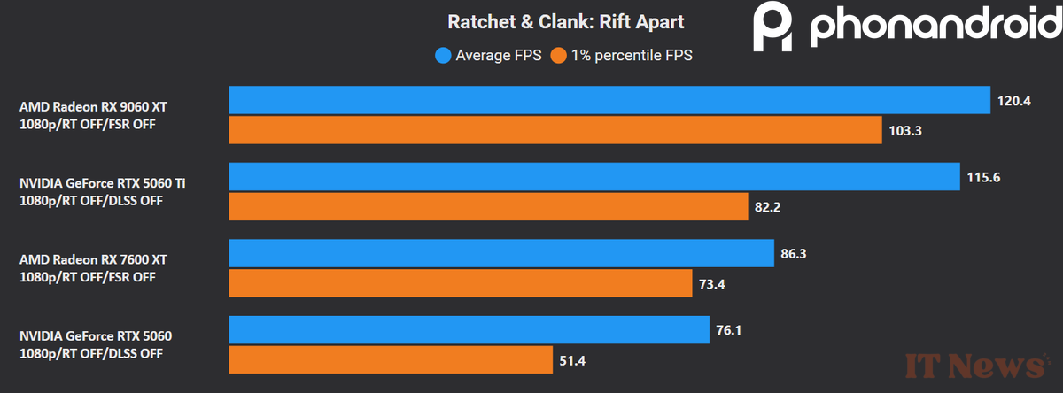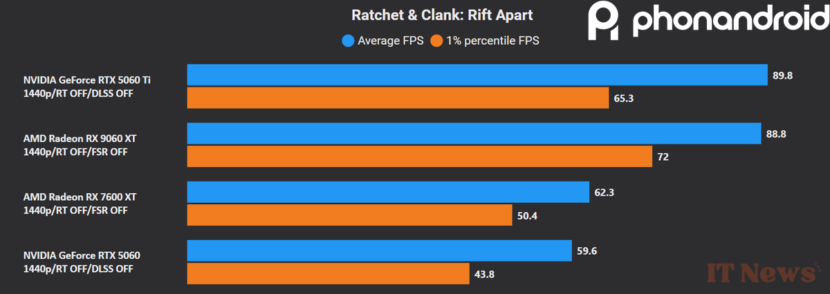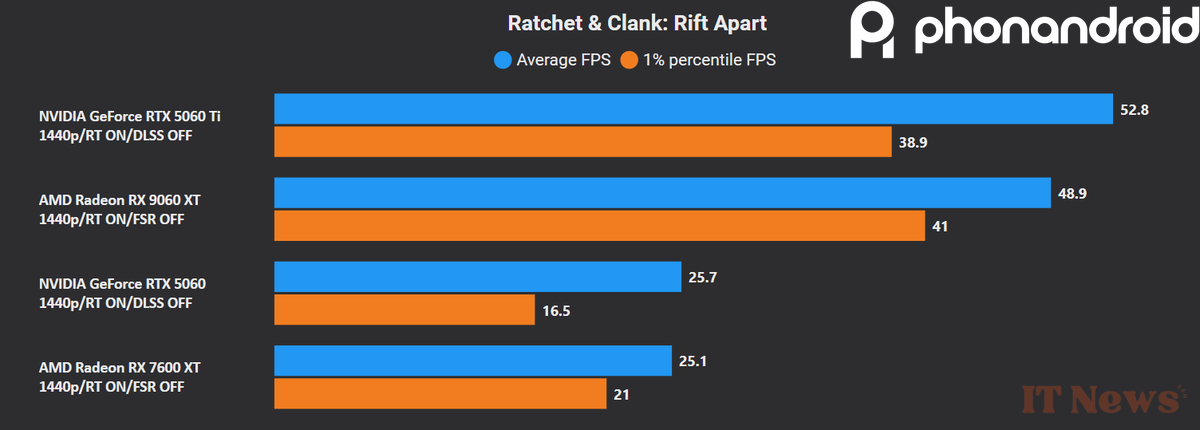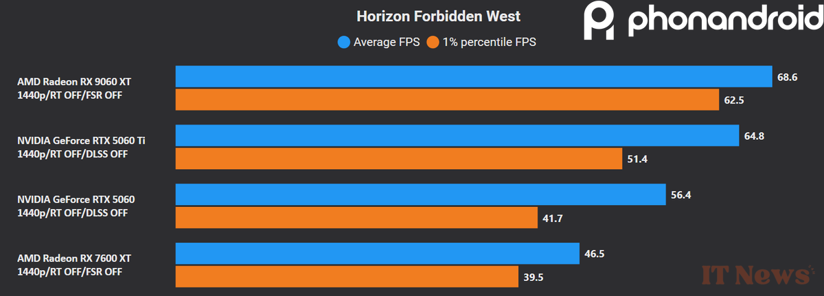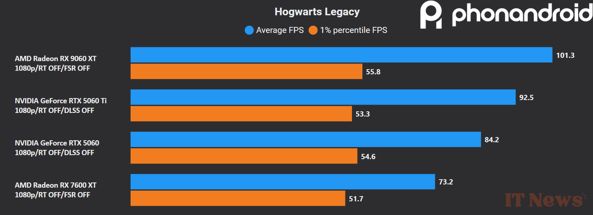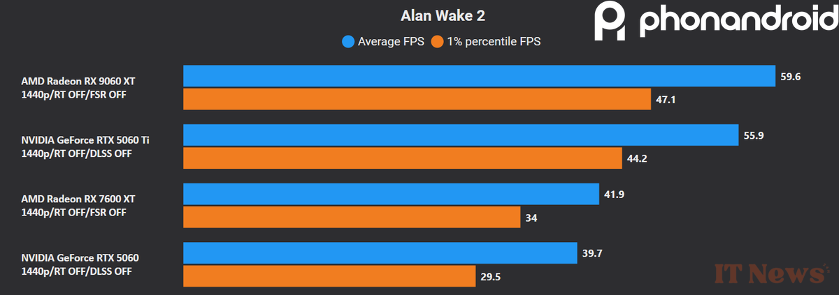 Without ray-tracing, the RX 9060 XT is theoretically in the lead again, but the RTX 5060 Ti sends essentially the same average FPS while keeping the experience more stable. The 5060 does much better, but remains behind by 21%.
