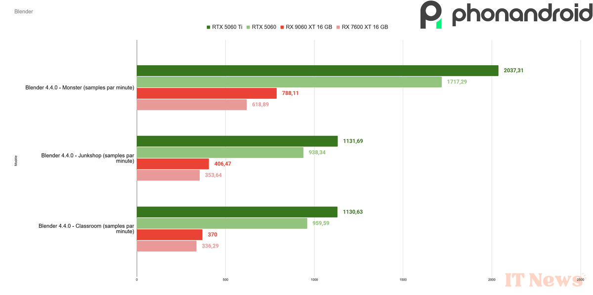 In Blender, NVIDIA remains the absolute king of its domain. 54% less than the RTX 5060 on Monster, 56% less on Junkshop and 61% less on Classroom… It still stings.