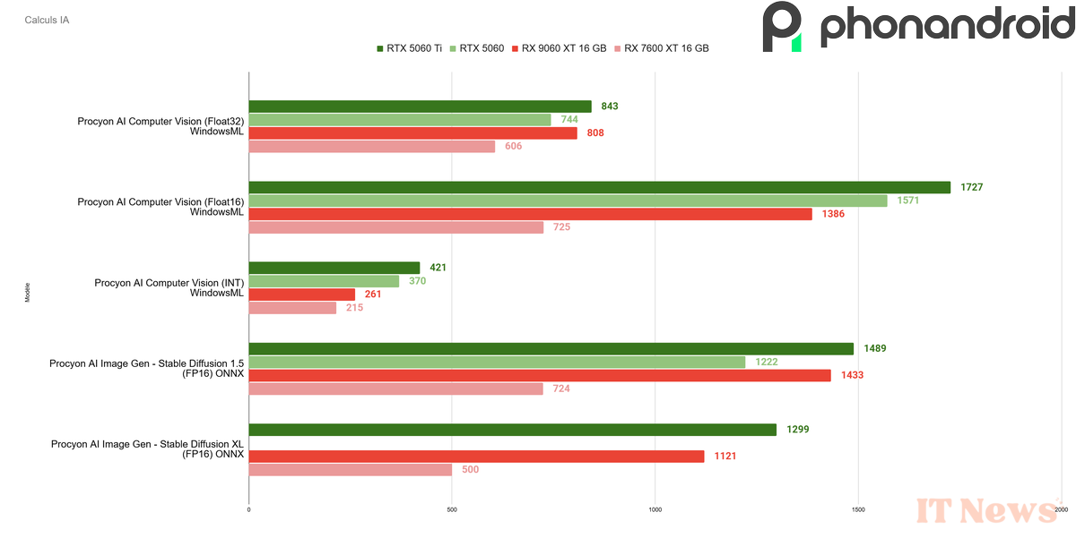 AI calculations are improving at AMD, although they are still lagging behind. Here, the RX 9060 XT manages to be equivalent in Float 32, but drops by 12% in Float 16 and by 29% in integers. On a Stable Diffusion creation, the 16 GB RX 9060 XT manages to equal the 16 Gb RTX 5060 Ti in the normal version, but loses by 13% in the XL version. The 5060 lacks VRAM to run this last test.