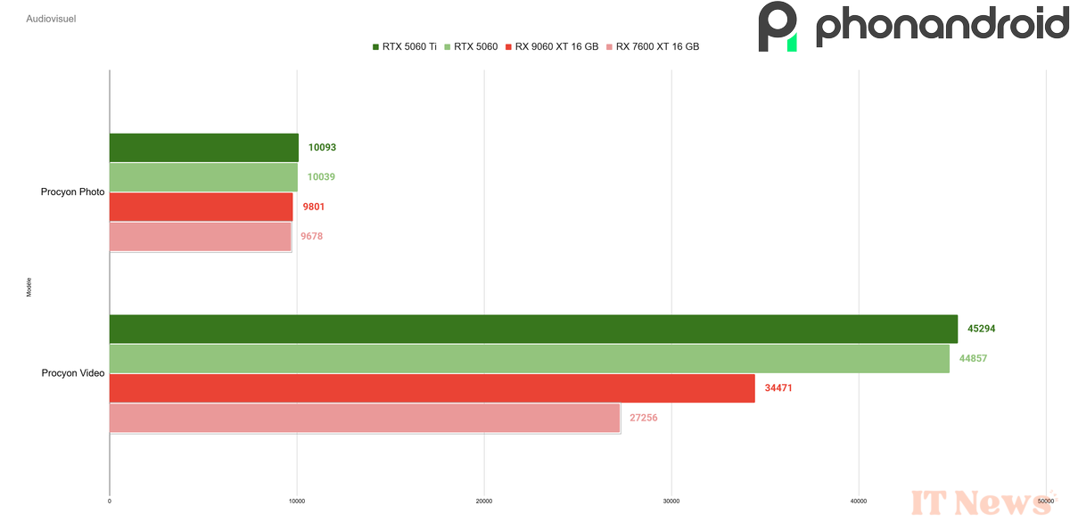 In photography, as is often the case, we're on a par with all the cards we compare. But in video, AMD still has some work to do. The RX 9060 XT offers 23% lower performance than the RTX 5060.
