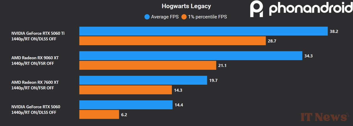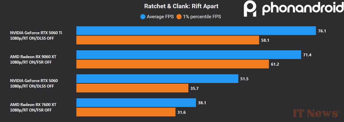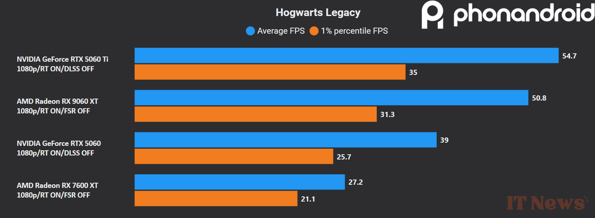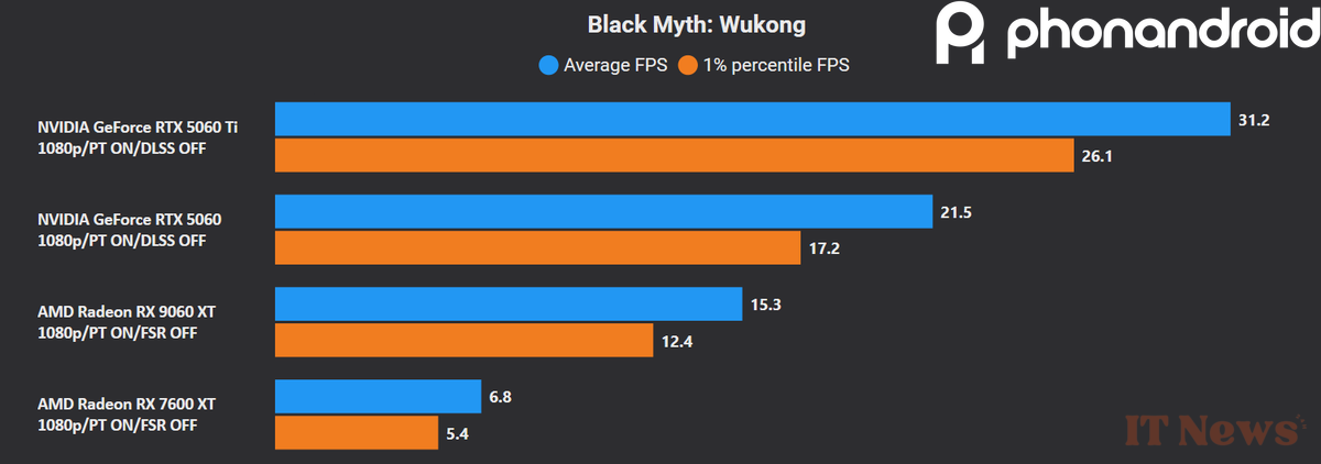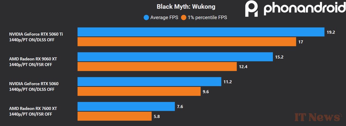 In 1080p, RT pushed to the maximum, RTX 5060 Ti is slightly higher by 7%, when the RTX 5060 remains behind by 38%.