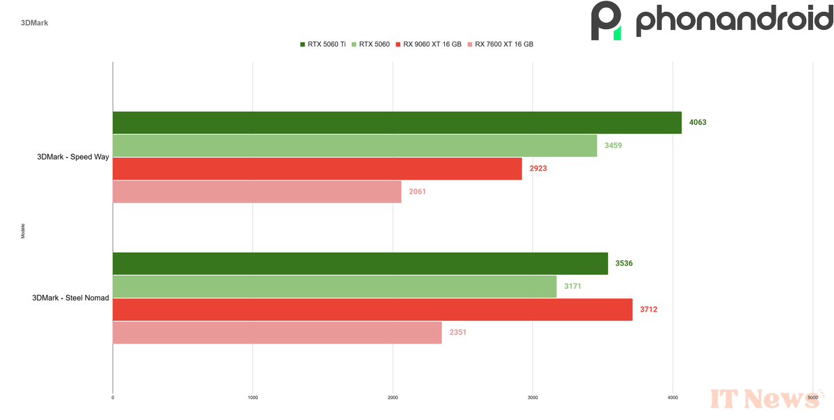 On Speed Way, dedicated to ray-tracing performance, the RX 9060 XT is inferior by 15% compared to the classic RTX 5060 and much more compared to the 5060 Ti. However, on Steel Nomad dedicated to pure raster, we can see that AMD's latest outperforms both the 5060 and the 5060 Ti by a small 5%. That's famous.