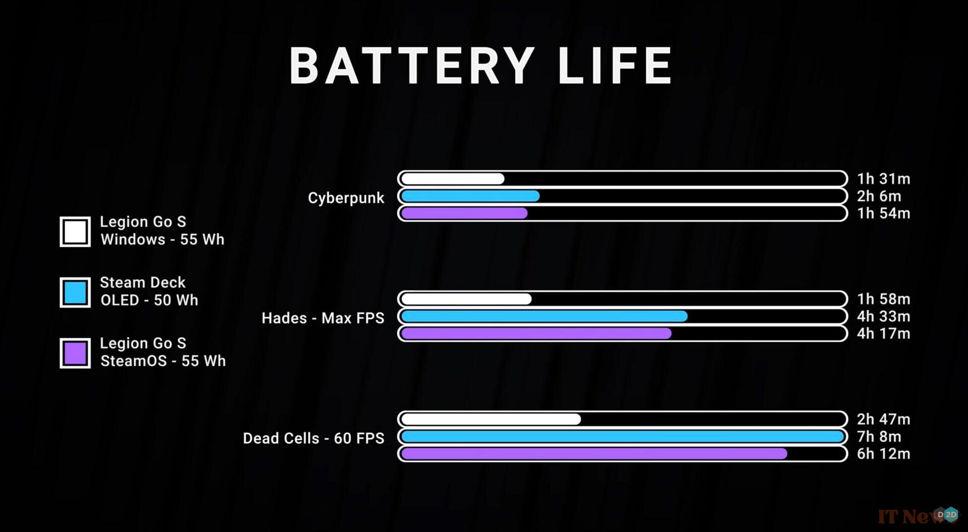Better yet, the battery life of the Legion Go S under SteamOS is superior, and sometimes even much superior, to the Windows version. The first one lasts 1 hour 54 minutes with Cyberpunk 2077, which is 23 minutes longer than the second one. The difference becomes a chasm with less demanding games like Hades (4h17 on SteamOS, compared to 1h58 on Windows) and Dead Cells (6h12 compared to 2h47).