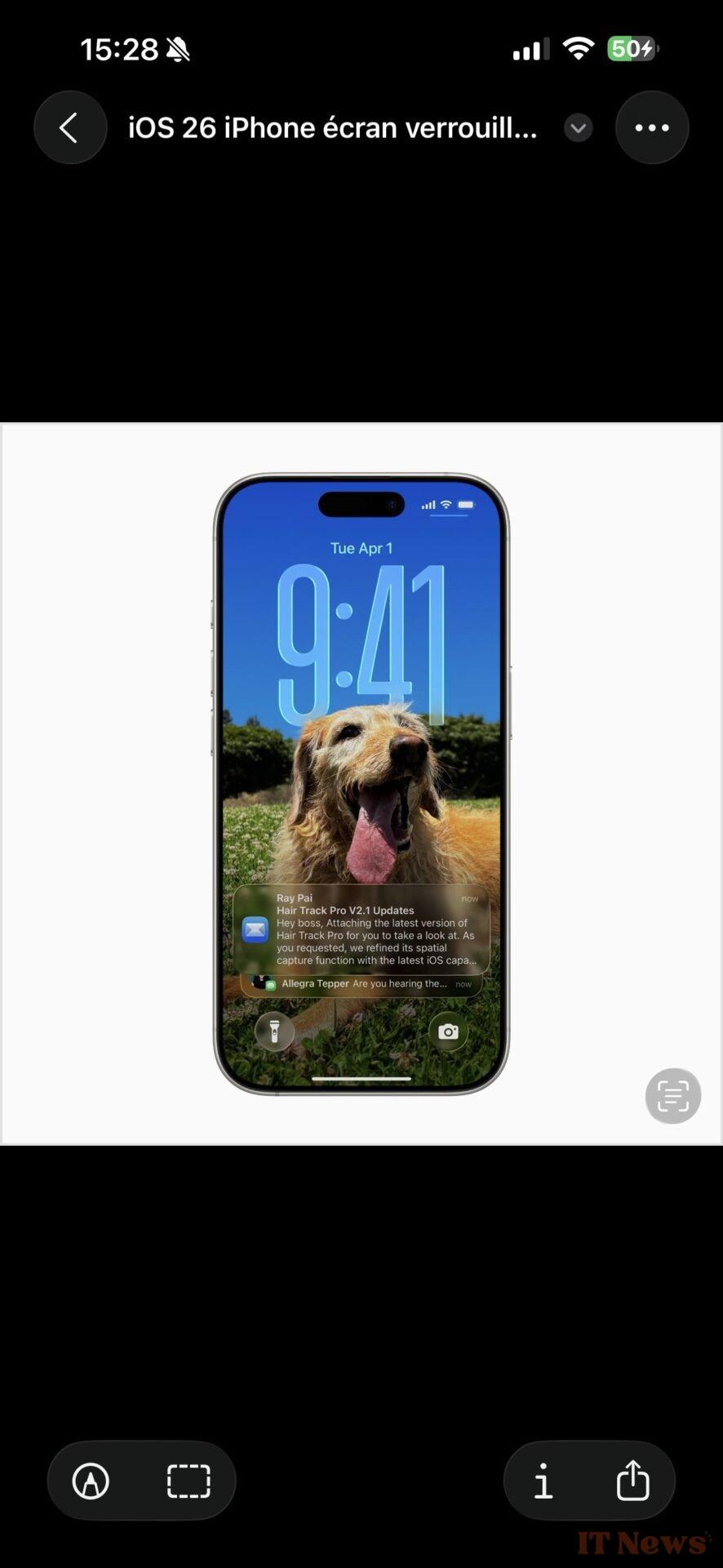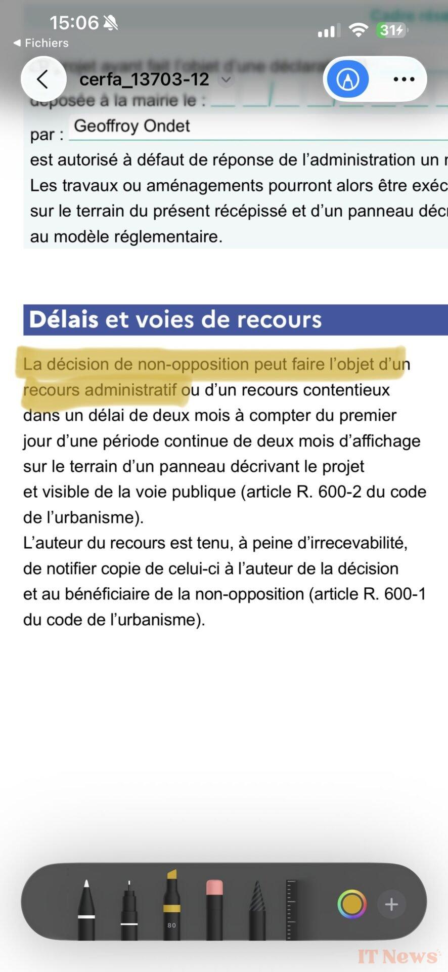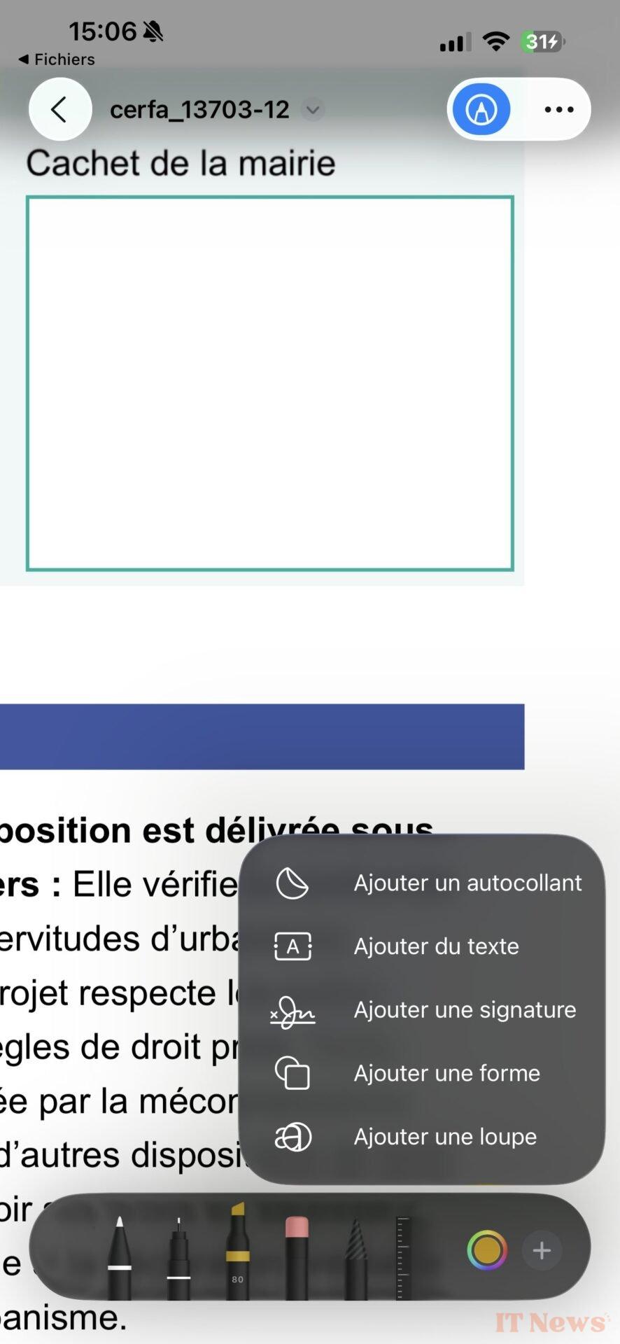 On iOS 26, Preview displays your PDFs in full page, and provides access to the various tools in a simplified bar, accessible at the bottom left of the screen. There, you'll find the annotation module, thanks to which you can scribble in different colors with several "pencil" styles. This also includes access to various tools for adding a sticker, a block of text, a signature, a shape, or even a magnifying glass to highlight an element of the document.