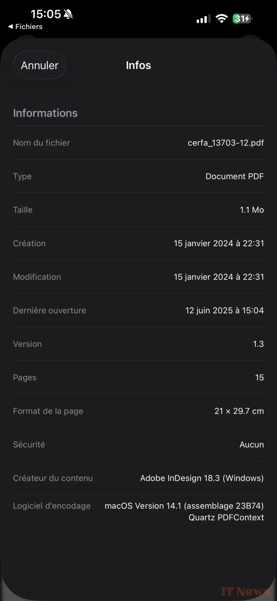 Furthermore, as on a Mac, you can view detailed information about a file ("i" button) and can even search for text directly in your documents. As for the sharing options, they will allow you to Save your PDF to Files, and perform certain actions, depending on the other applications installed on your device. If you use Microsoft Word, for example, you can convert your PDF documents into Word documents.