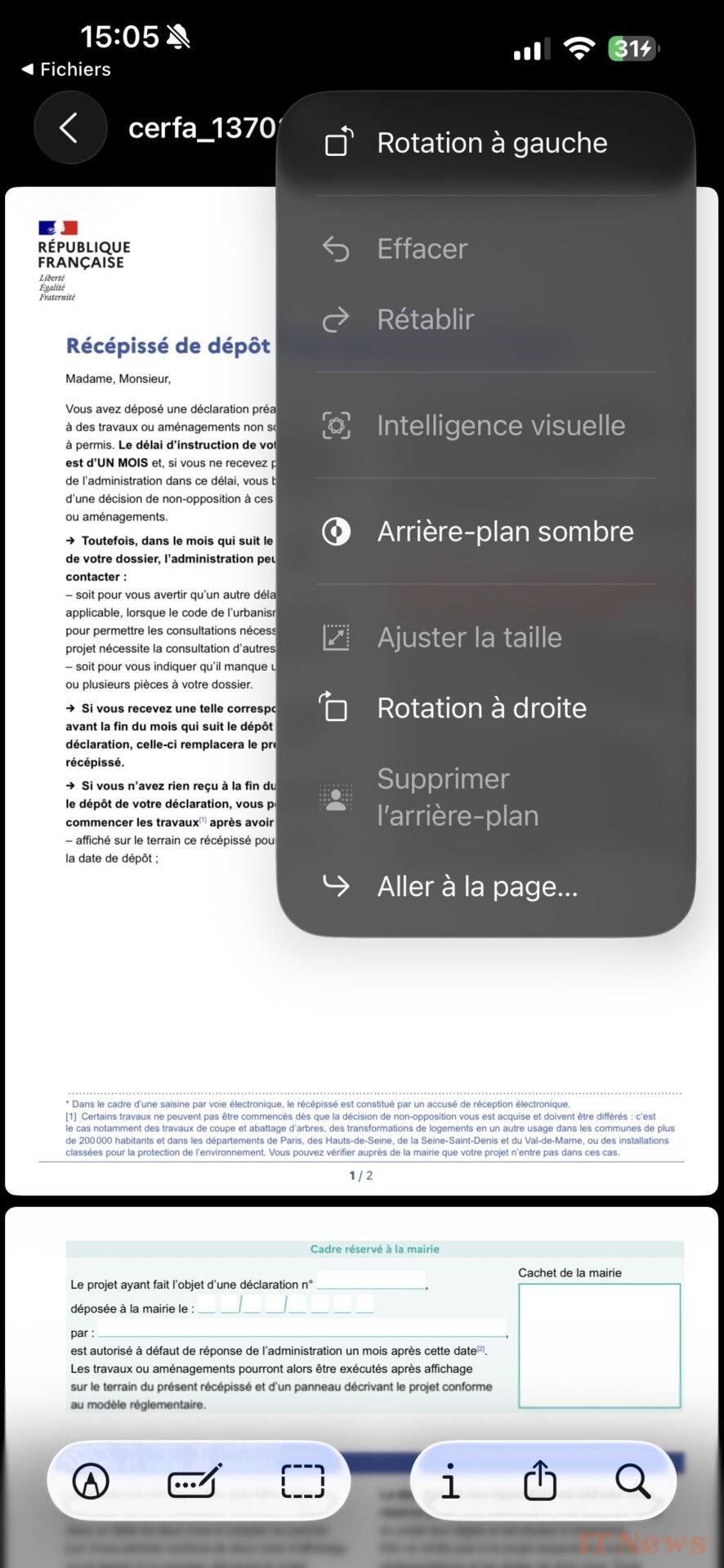 For the rest, the various actions possible on a document (rotation, deletion or redoing an action, adjustment of the size of a file, etc.) are grouped in the main menu represented by three small dots at the top right of the screen.