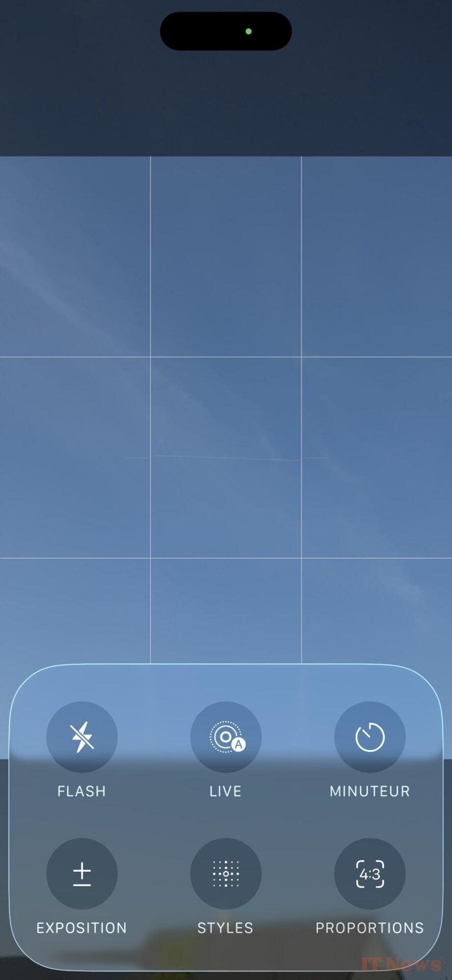 Furthermore, access to the shooting options in Photo mode (flash, live photos, timers, exposure, etc.) is done by sliding a finger upwards. You can also select the button with six small dots, grafted to the top right of the screen, next to the quick settings to manage the flash and night mode. By long-pressing this quick settings area, you can display the full menu of these settings.