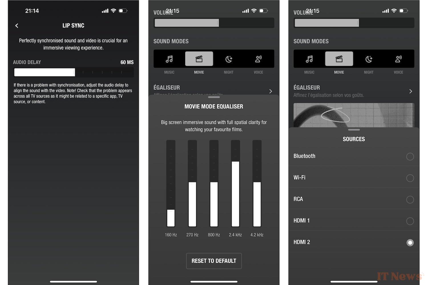 All of them fulfill their mission perfectly. To go further than these presets, a 5-band manual equalizer is also available; as is the adjustment of sound synchronization with the image and the switching between the different sources (Bluetooth, Wi-Fi, RCA, HDMI 1 and HDMI 2). It is also through this application that we launch the calibration process for the room in which the bar is placed.Bass that allows you to do without a subwoofer