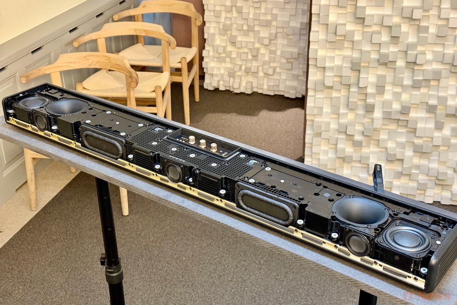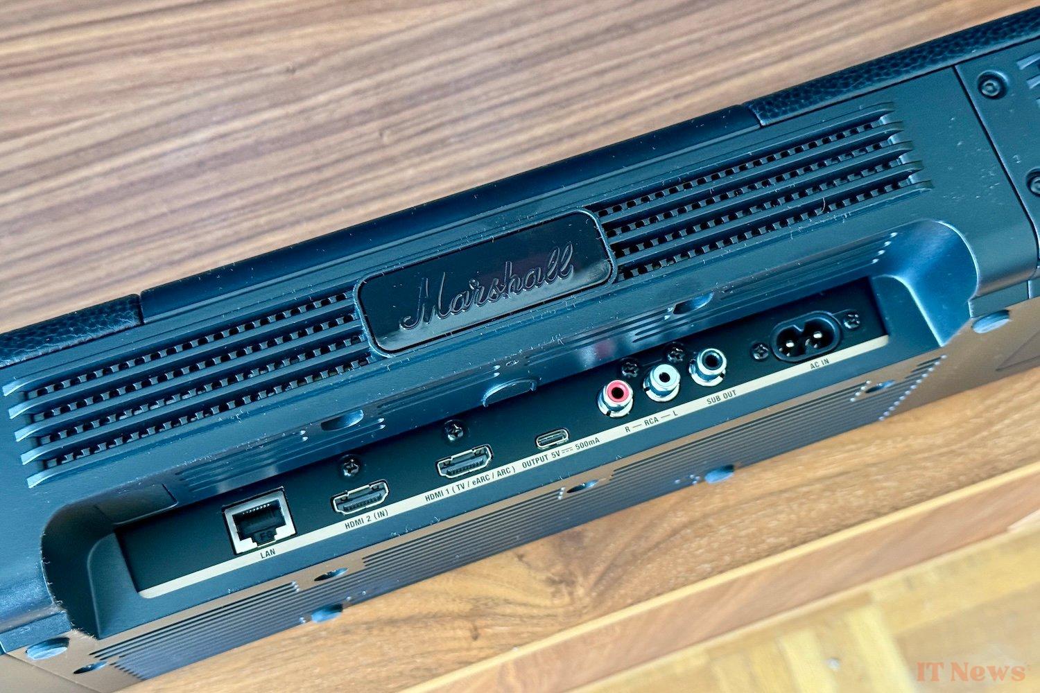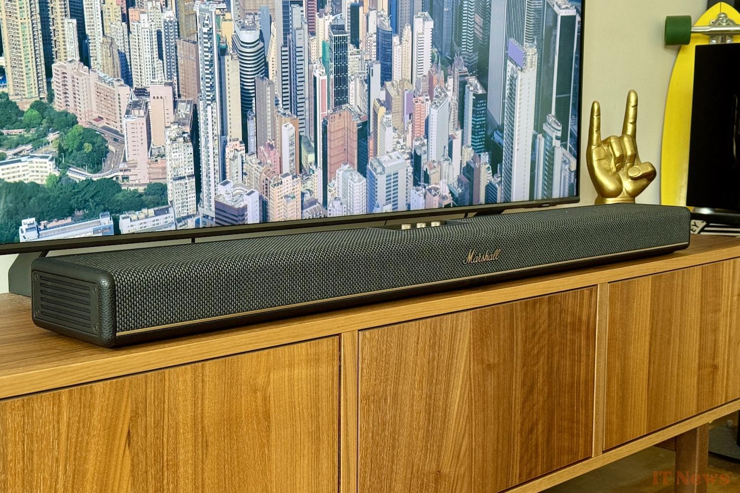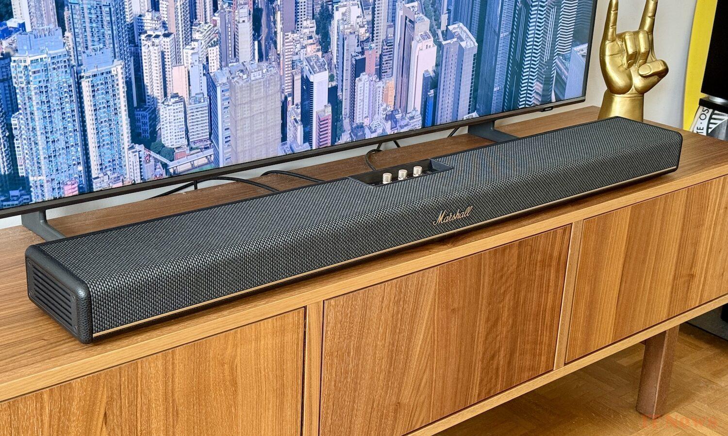 It was on the occasion of this extremely important launch for the brand that we were able to speak at its Stockholm headquarters with the engineers who developed the device for two years. The basic idea is logical: to enter the very buoyant soundbar market, Marshall had to maintain its identity; both auditory and visual. The choice was therefore made to design a model that was obviously compatible with current home cinema audio standards (Dolby Atmos and DTS:X), without making music listening the poor relation (65% of soundbar owners also use them to listen to music). In a world of sad, gray parallelepipeds, Marshall also had a card to play on the design side by retaining the codes of the guitar amps that made its speakers and headphones successful.