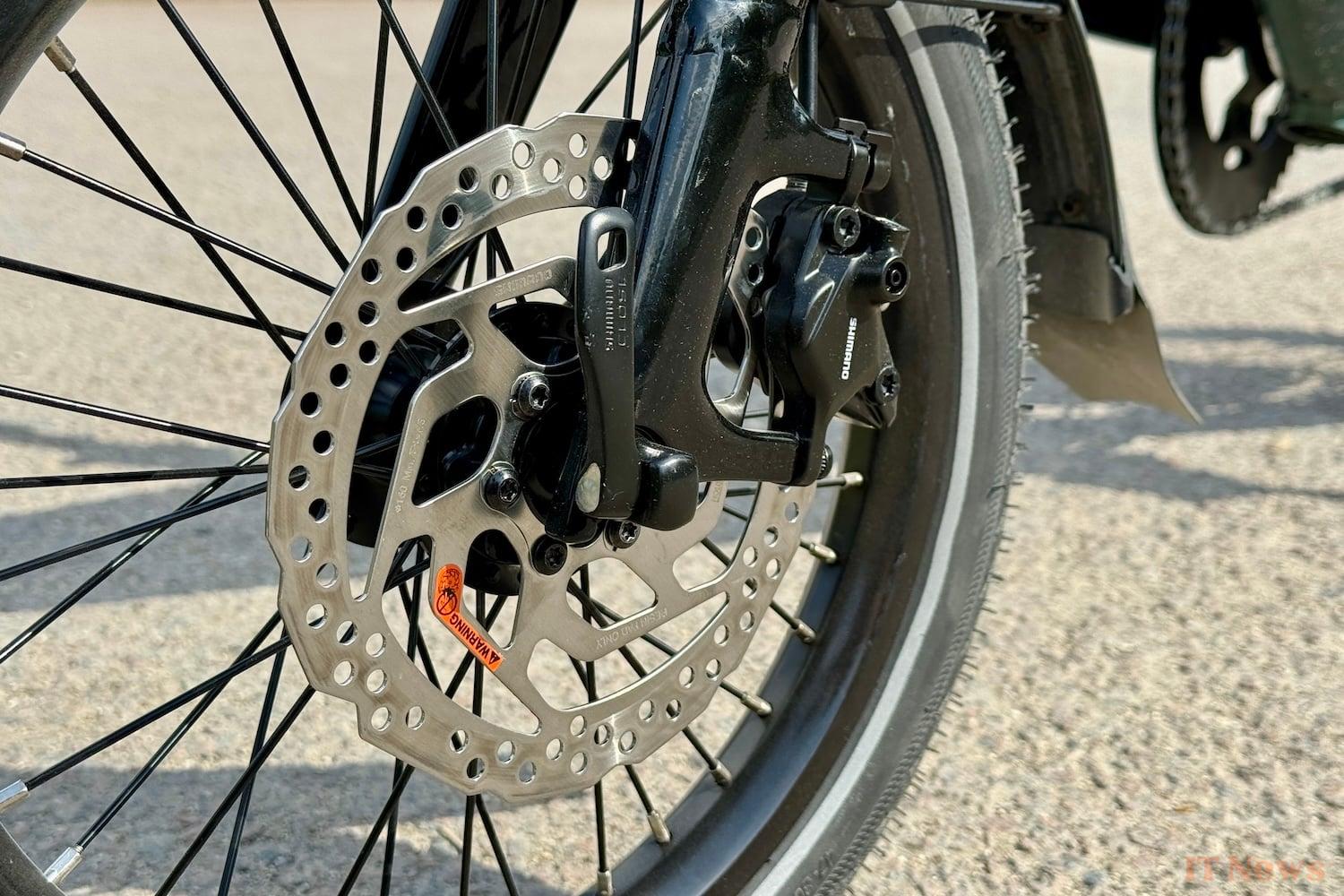 The components chosen for the JIM are also up to scratch. The 16-inch wheels are equipped with excellent 1.75-inch Schwalbe Road Cruiser tires. Enough to grip the asphalt well and filter the road for a little comfort. But it's especially on the brakes side that O2feel didn't skimp, equipping it with a 160mm Shimano MT410 hydraulic disc system. The bite and power are there, and there, needless to say, it brakes hard and responds perfectly. A quality that fits well with the bike's liveliness.