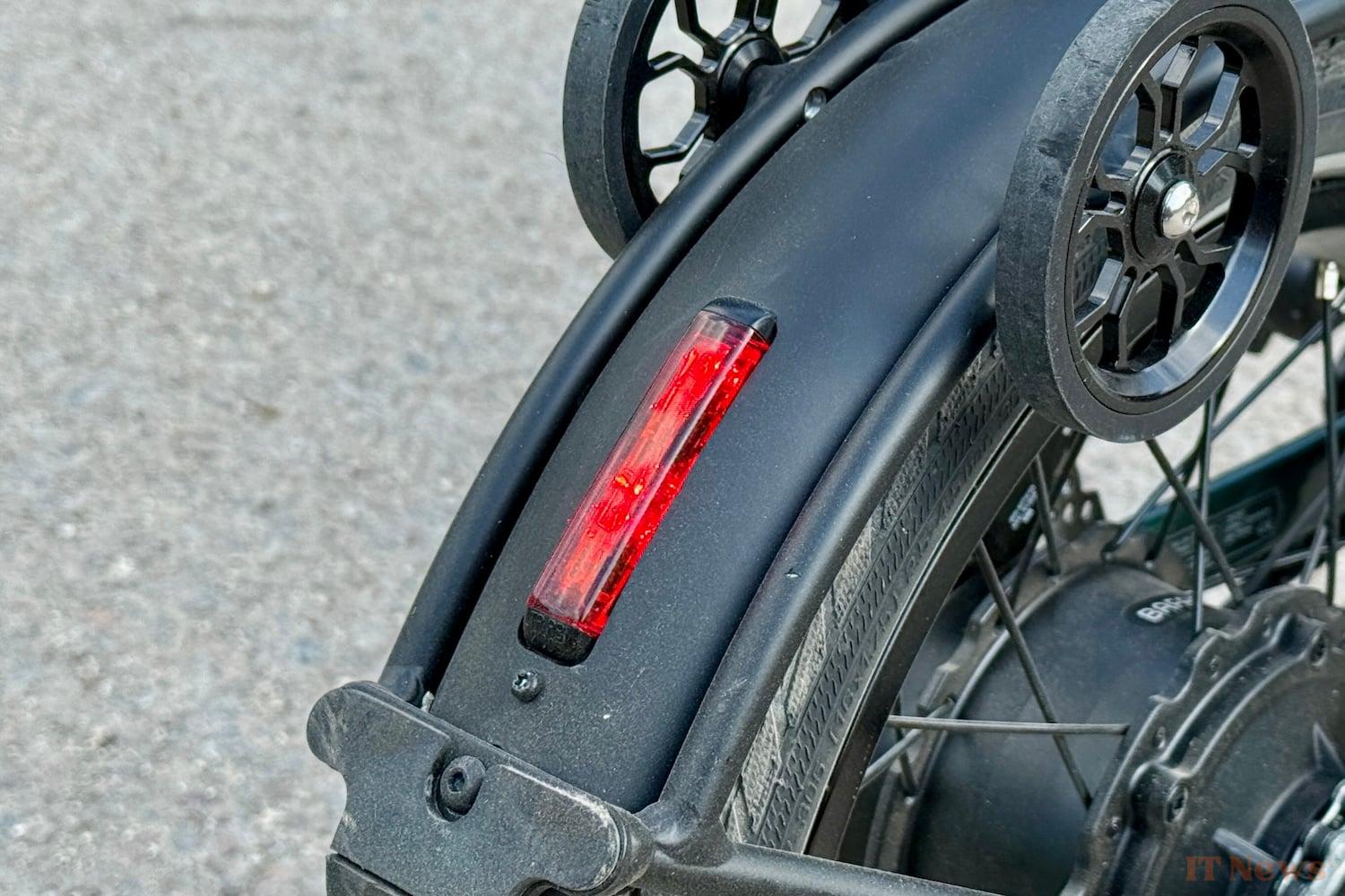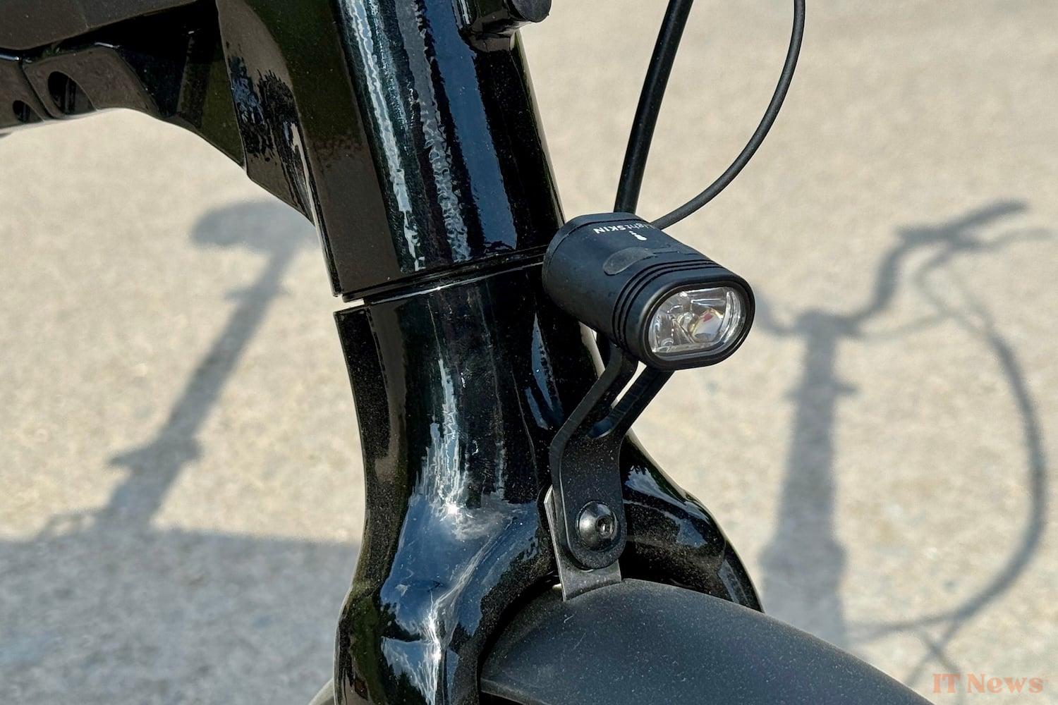 The equipment is relatively complete with mudguards, folding pedals, 150 lumen Lightskin UE2 front light and rear light with brake detection. It doesn't have a rear rack, but a mounting system on the head tube to have one at the front.