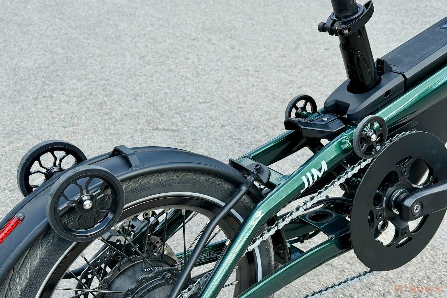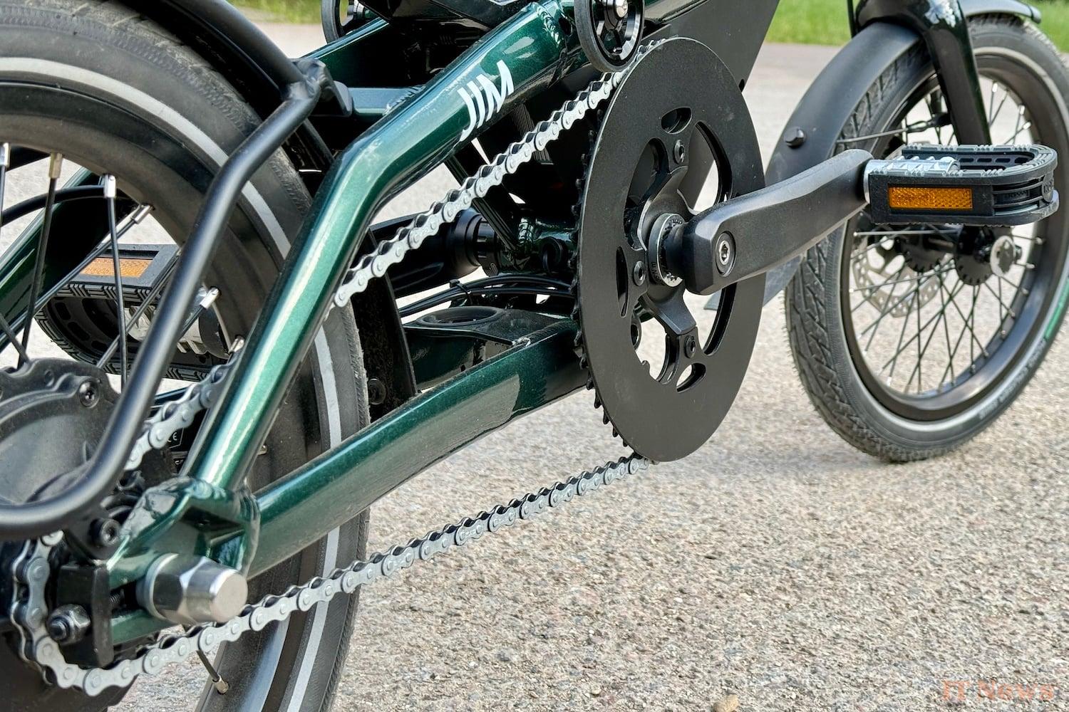 The chain drive and the absence of a derailleur should not lead you to believe that the JIM is a single speed. Rather than using this highly exposed component when it comes to a folding model, the manufacturer has opted for a two-speed automatic transmission. This is integrated directly with the Bafang H700 motor within the rear hub. There is no selector on the handlebars, nor a twist grip to change gears. Here, they are selected automatically depending on the speed. When you start pedaling, first gear is engaged by default and shifts to second at around 10 km/h. When you stop, first gear re-engages and allows you to start again without forcing. Simple and very effective.