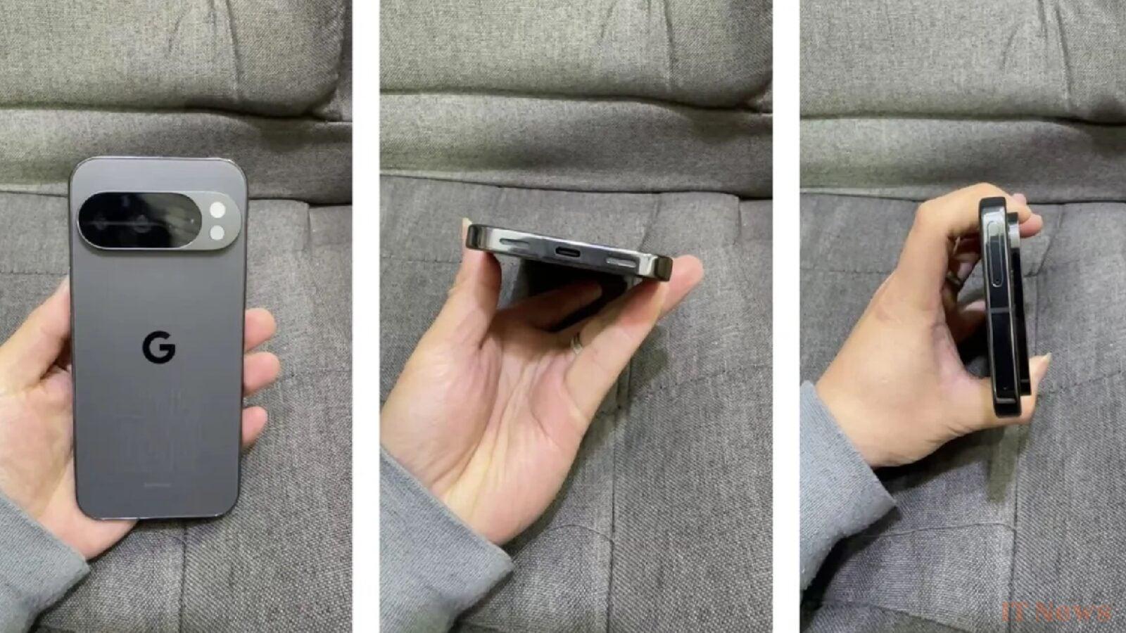 The photos show a design similar to the Pixel 9 Pro, with some visible adjustments. The camera bar on the back remains present, still shaped like a large pill, but appears even wider and perhaps thicker than that of the previous model. It features three sensors, an LED flash, and what looks very much like a temperature sensor, as on previous models.