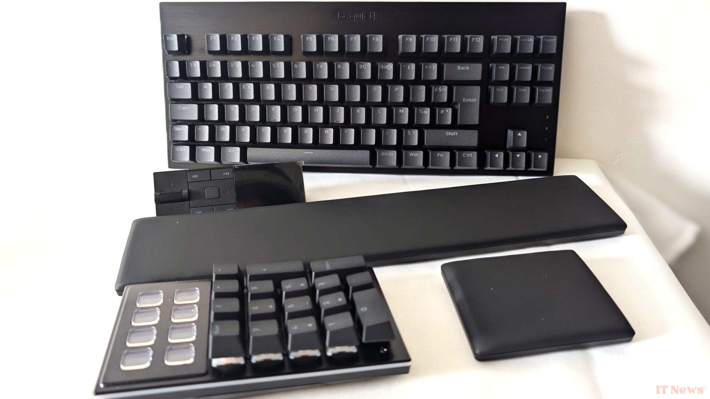 The Dark Mount comes with a braided and reinforced USB-C cable to connect to the PC, as well as several pads and a pair of tweezers to remove keycaps and switches if necessary. A fully equipped kit, in short. It also comes with two excellently made wrist rests. One fits over the main keyboard, the other under the numeric keypad. Again, everything is magnetic, making it durable and easy to install and remove. Note that the coating of the wrist rests is quite surprisingly soft, clearly our hands are very comfortable.