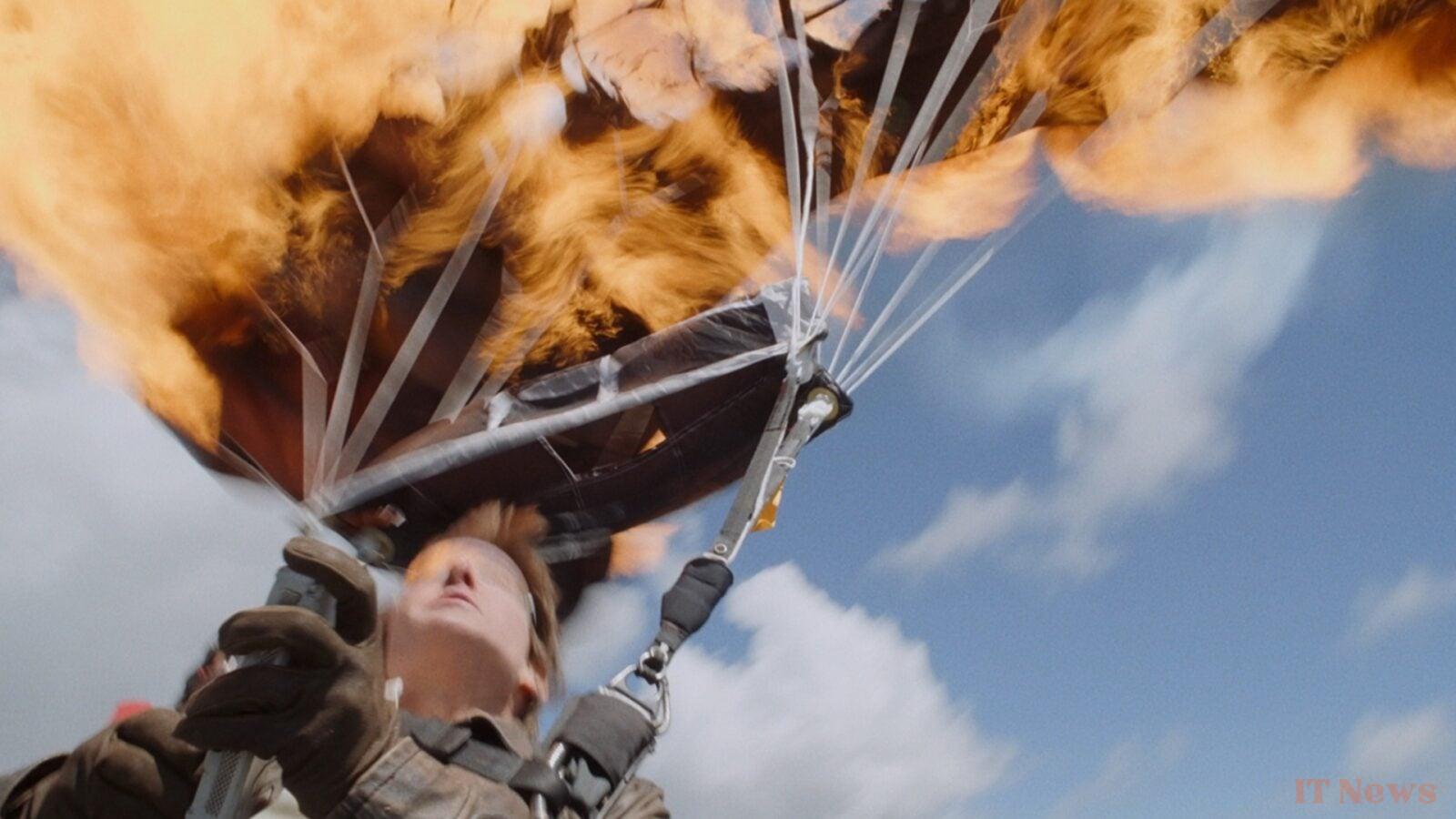 To achieve this spectacular sequence, the actor and his crew spent several weeks preparing in the Drakensberg Mountains of South Africa. They reached over 75,000 feet in an altitude of more than 22,000 meters in a helicopter. The actor then jumped into the void with a fuel-soaked parachute, before detaching and opening a reserve canopy.